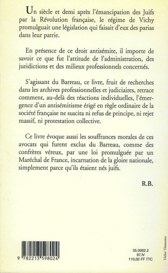Un siècle et demi après l'émancipation des Juifs par la Révolution française, le régime de Vichy promulguait une législation qui faisait d'eux des parias dans leur patrie. En présence de ce droit antisémite, il importe de savoir ce que fut l'attitude de l'administration, des juridictions et des milieux professionnels concernés. S'agissant du Barreau, ce livre, fruit de recherches dans les archives professionnelles et judiciaires, retrace comment, au-delà des réactions individuelles, l'émergence d'un antisémitisme érigé en règle ordinaire de la société française ne suscita ni refus de principe, ni rejet massif, ni protestation collective.