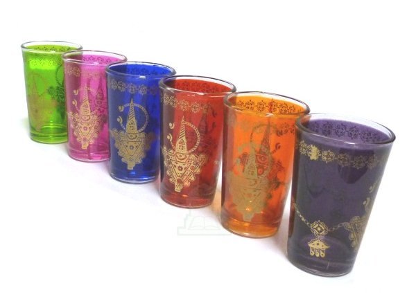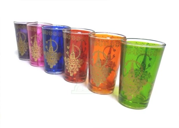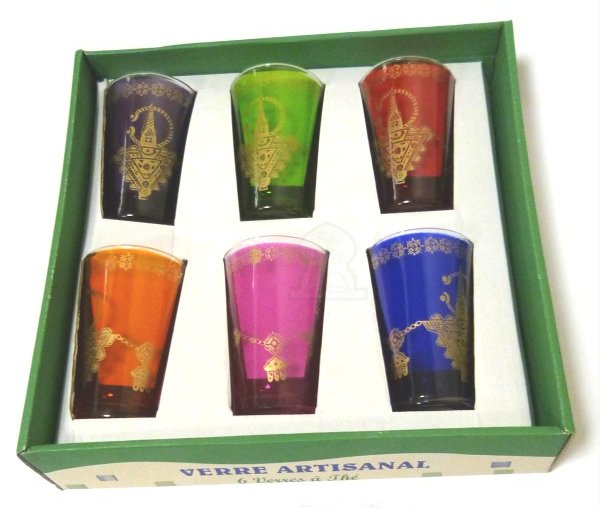 Vos dégustations de thé à la menthe seront désormais un plaisir éternel, avec ce pack de 6 verres à thé KHLALA, en provenance de Marrakech, avec plusieurs couleurs, et ornés de très beaux motifs traditionnels dorés...