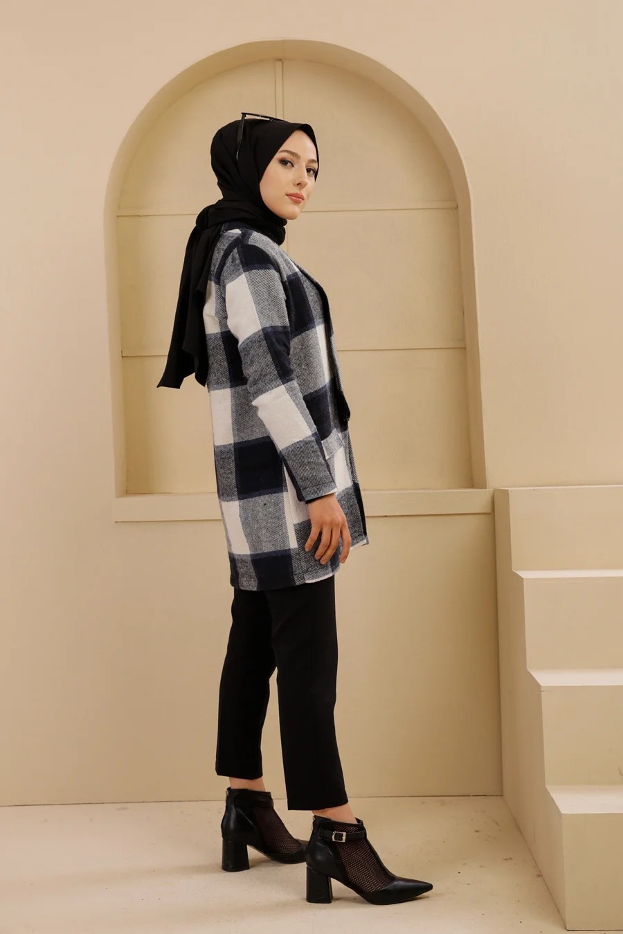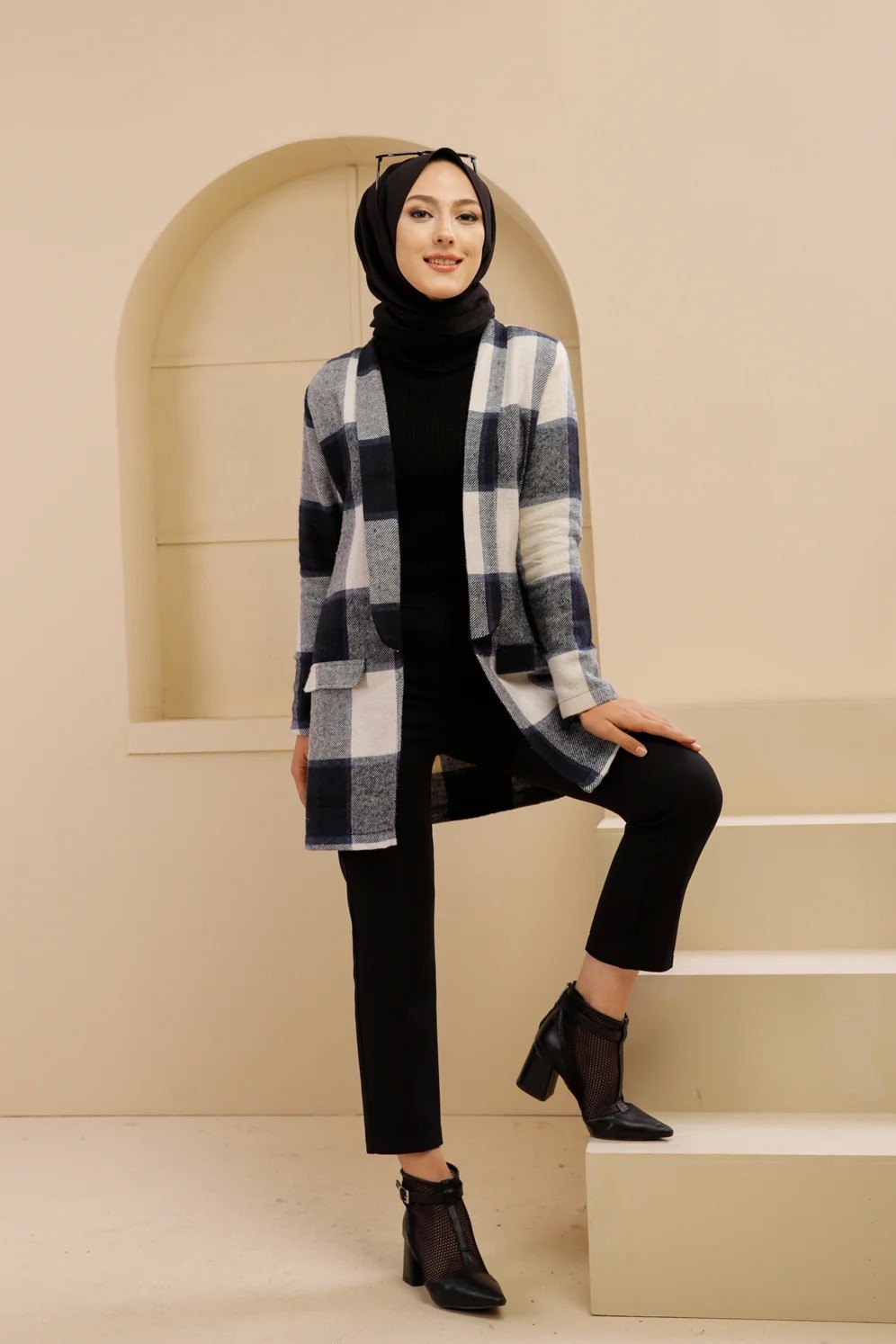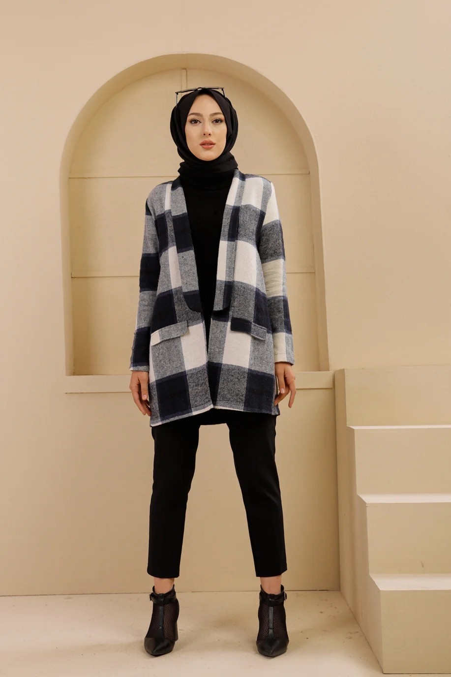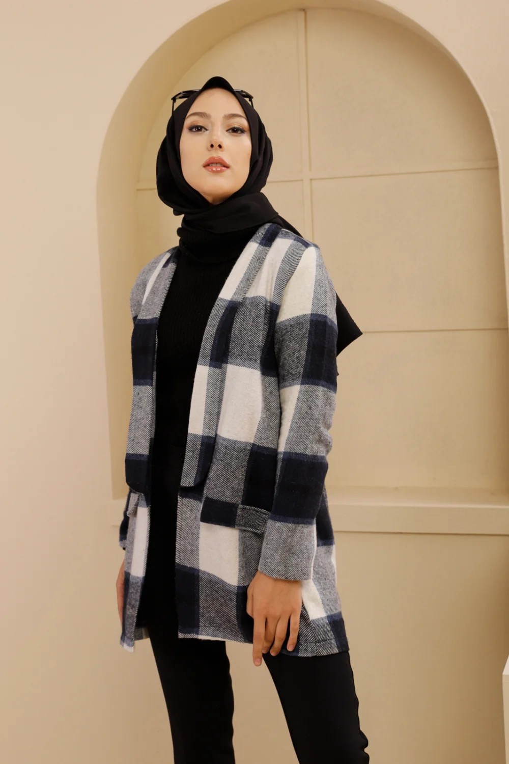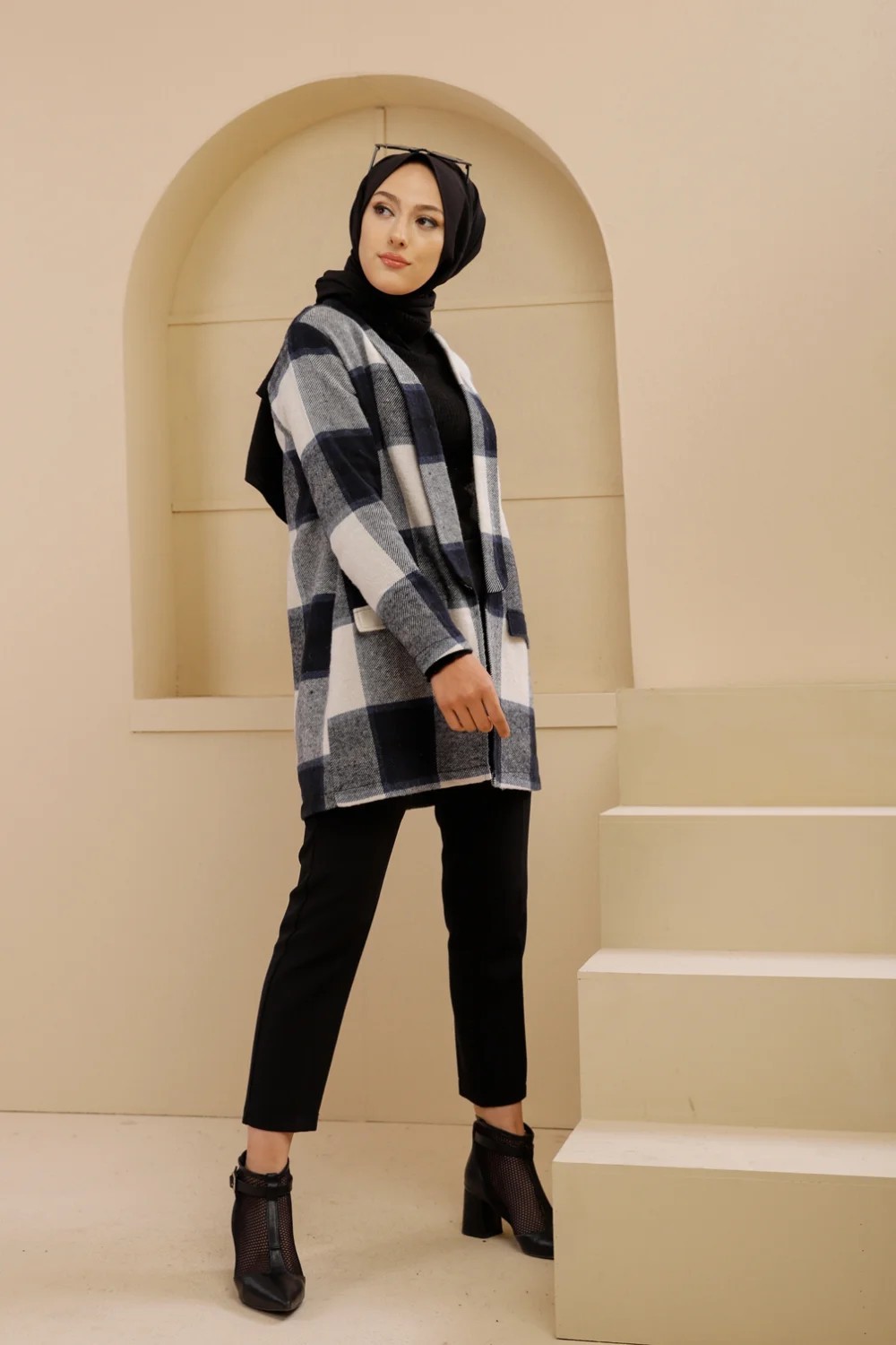 Veste-Manteau à carreaux (Vêtement chaud hijab saisons automne hiver) - Couleur bleu marine Vetement & Accessoire