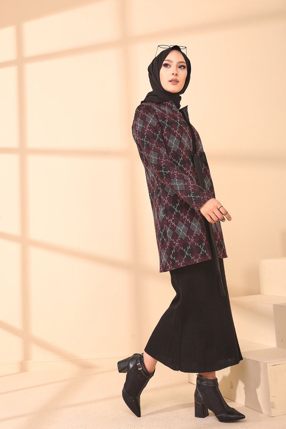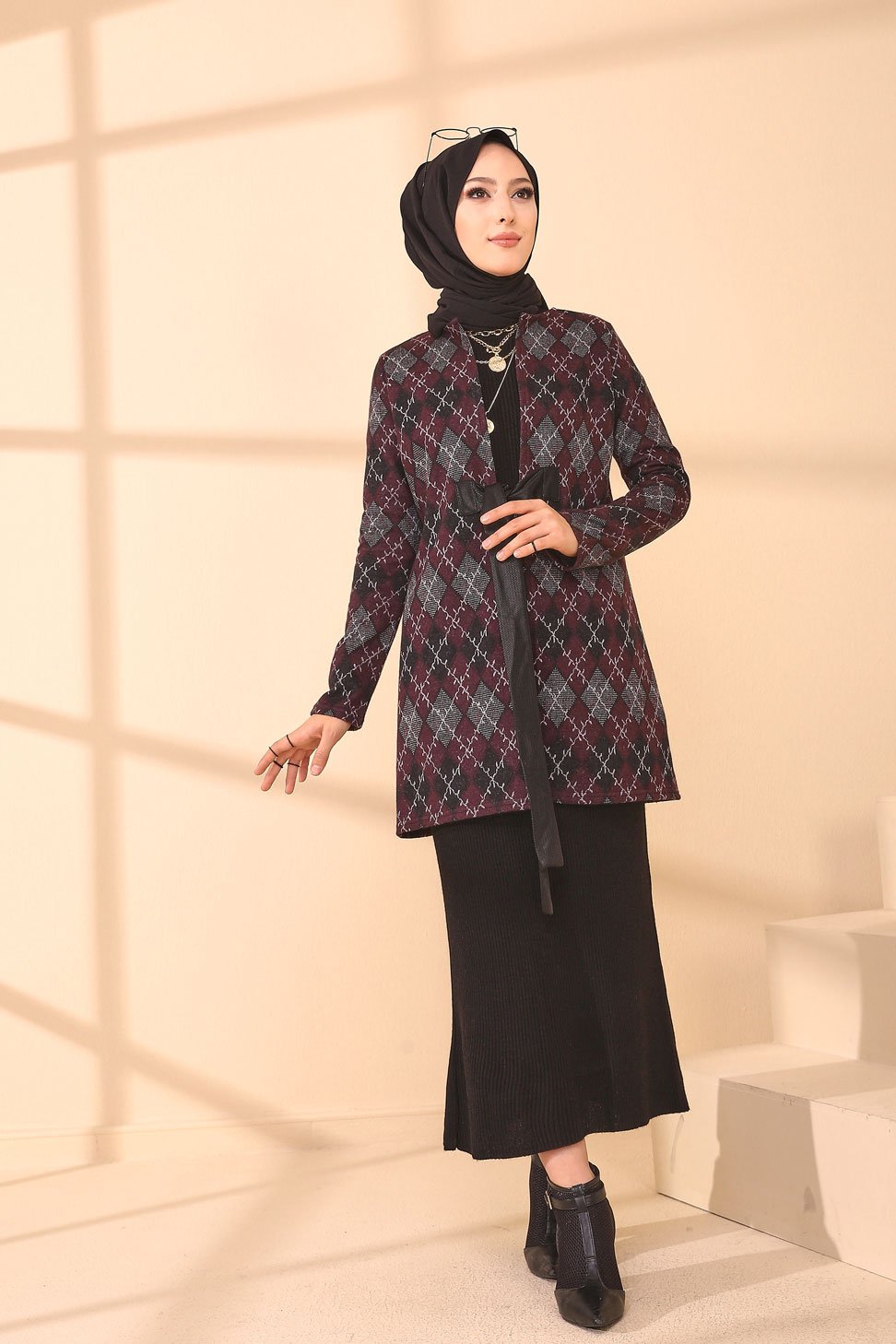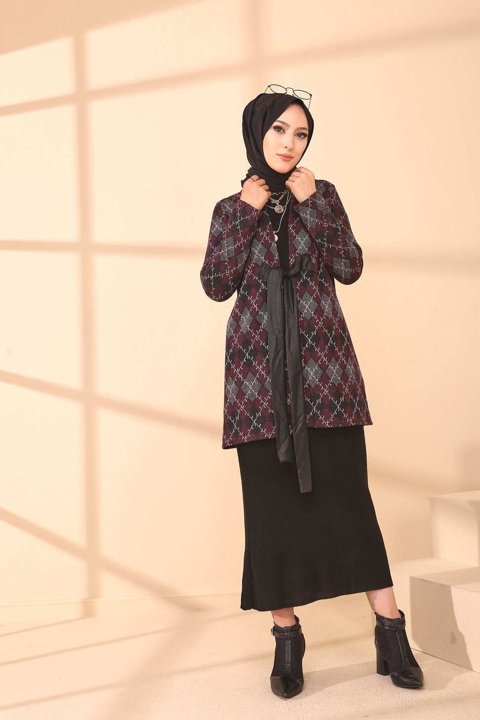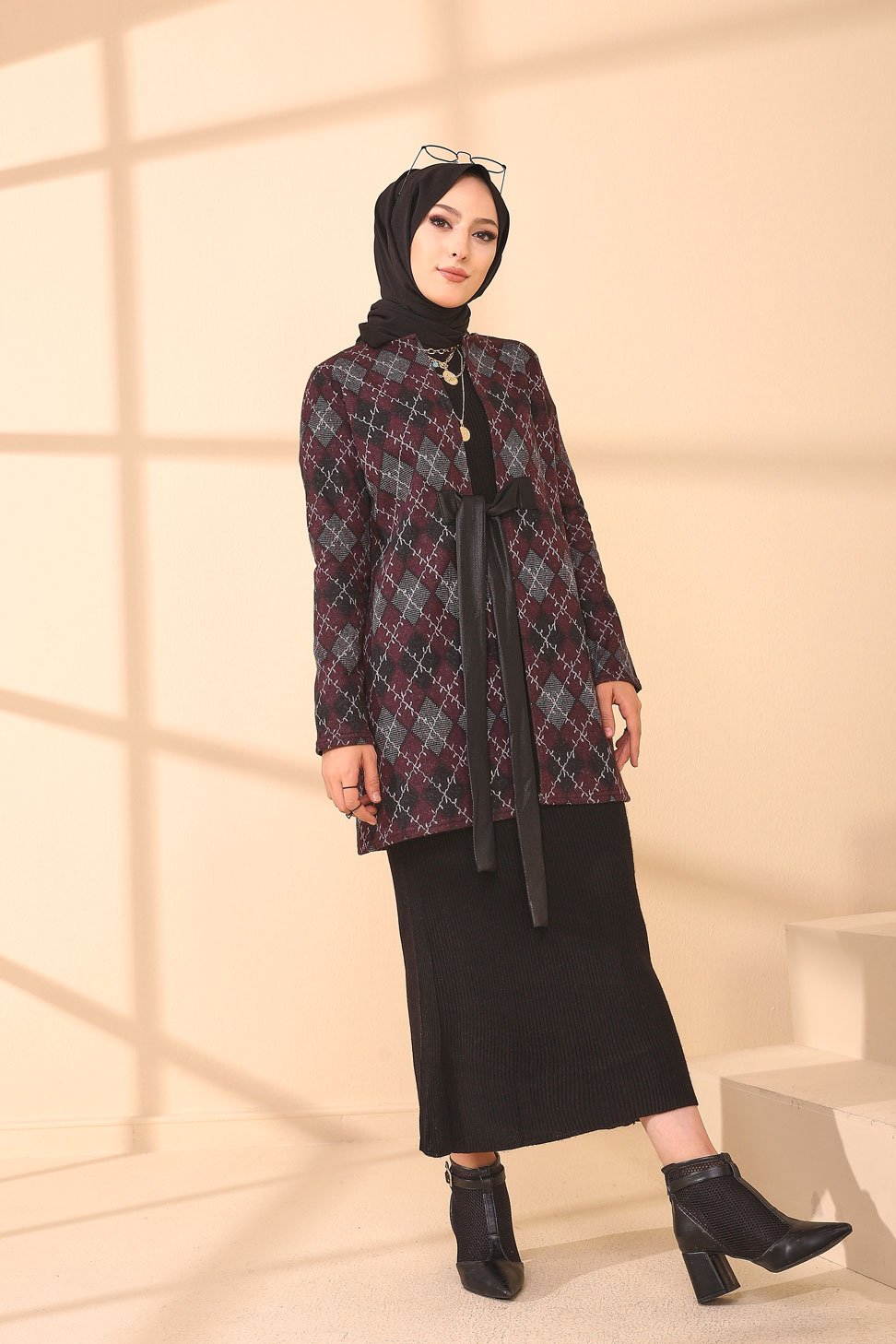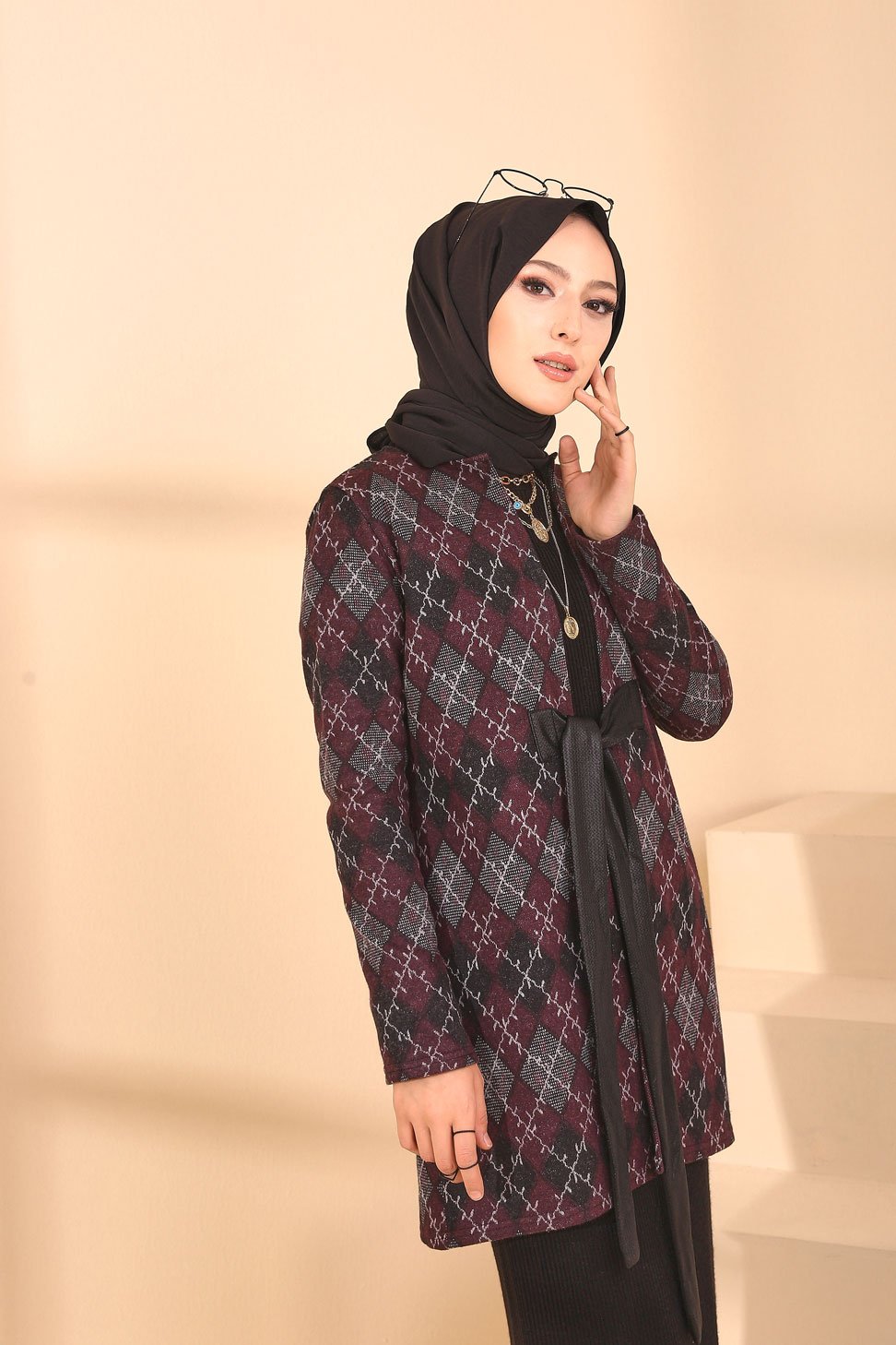 Veste Manteau femme avec ceinture intégrée (Tunique Automne Hiver - Boutique en ligne Vêtements Hijab Turquie) - Couleur noir et prune Vetement & Accessoire
