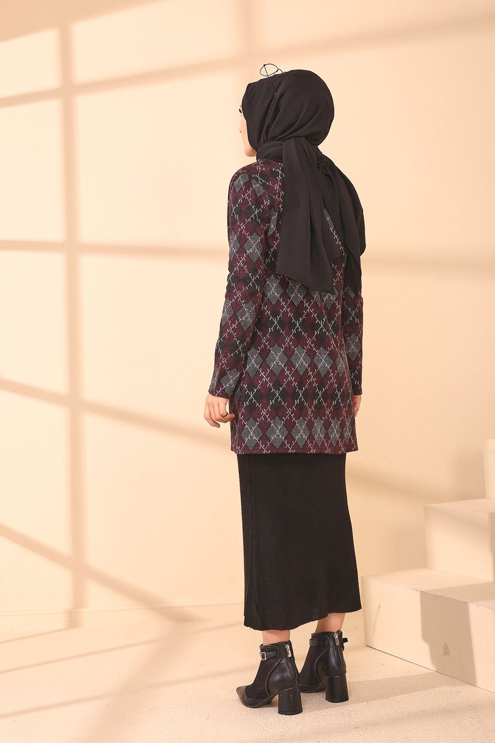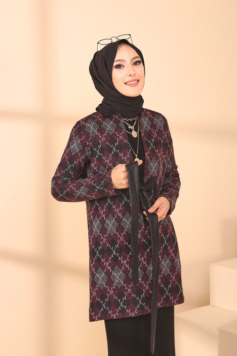 Veste Manteau femme avec ceinture integree (Tunique Automne Hiver - Boutique en ligne Vetements Hijab Turquie) - Couleur noir et prune