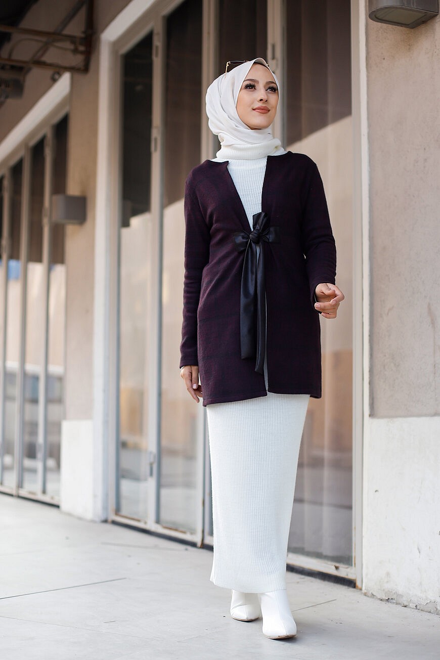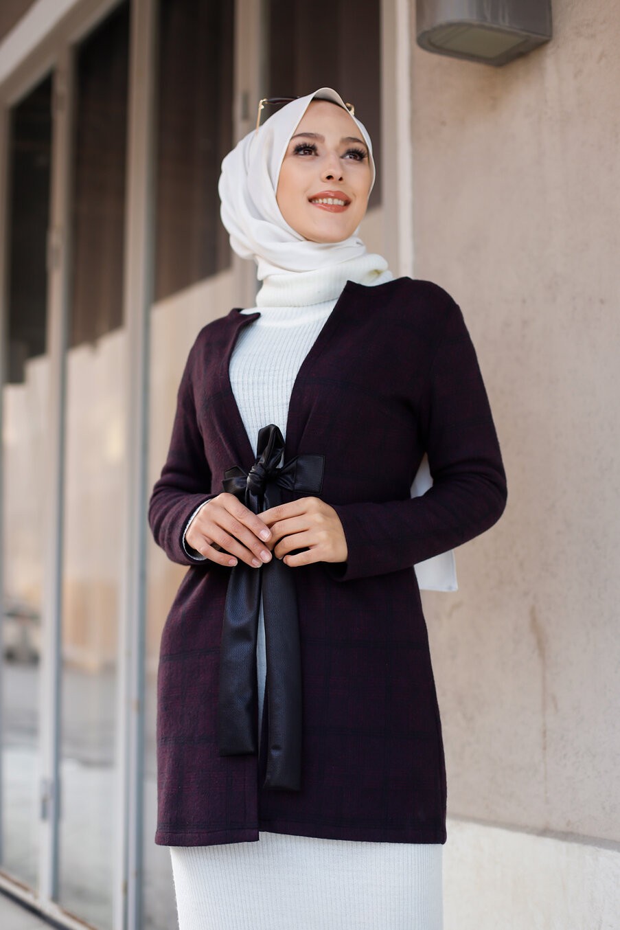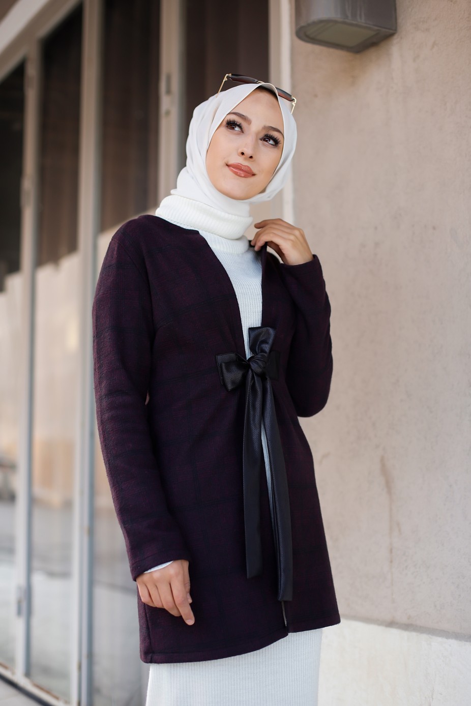 Veste Manteau femme avec ceinture intégrée (Tunique Automne Hiver - Vêtement Hijab Turque en ligne) - Couleur prune Vetement & Accessoire