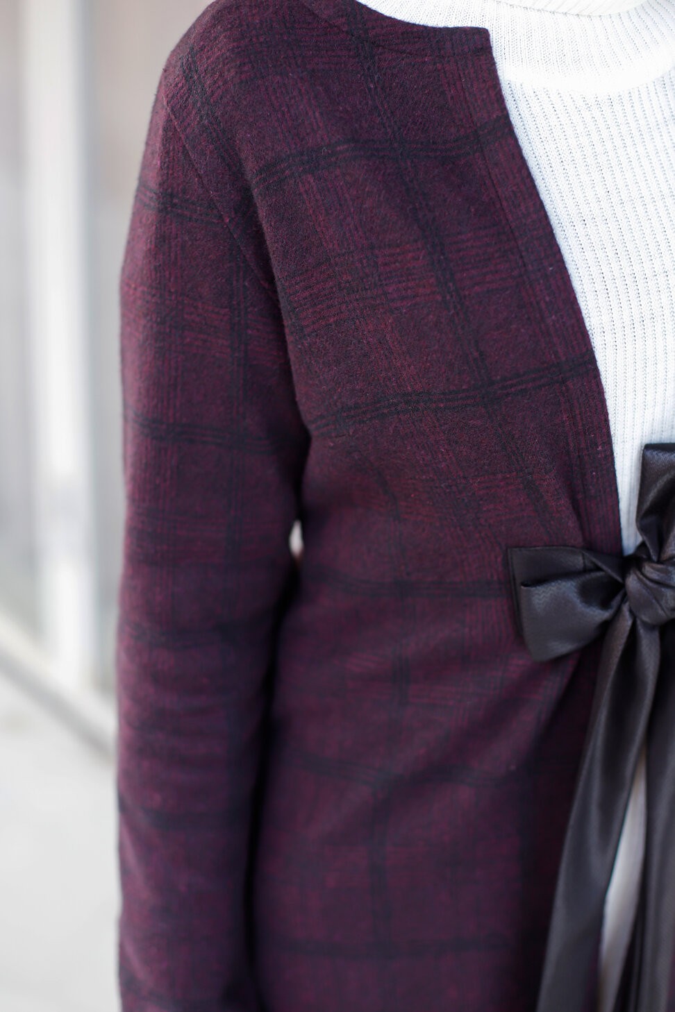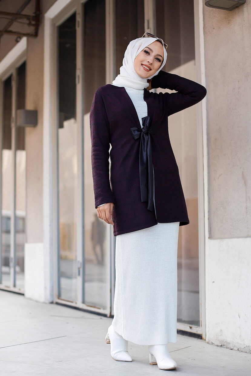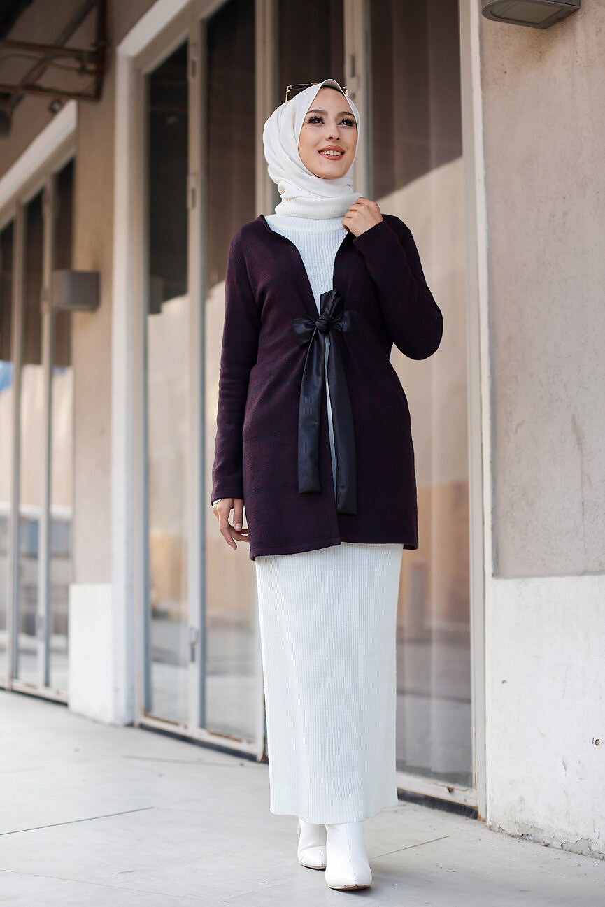 Veste Manteau femme avec ceinture intégrée (Tunique Automne Hiver - Vêtement Hijab Turque en ligne) - Couleur prune Vetement & Accessoire