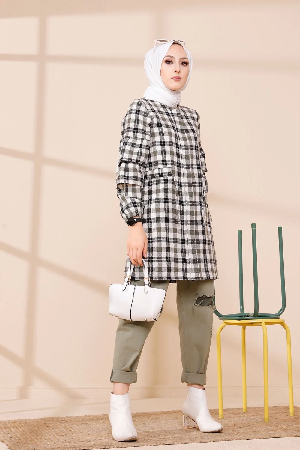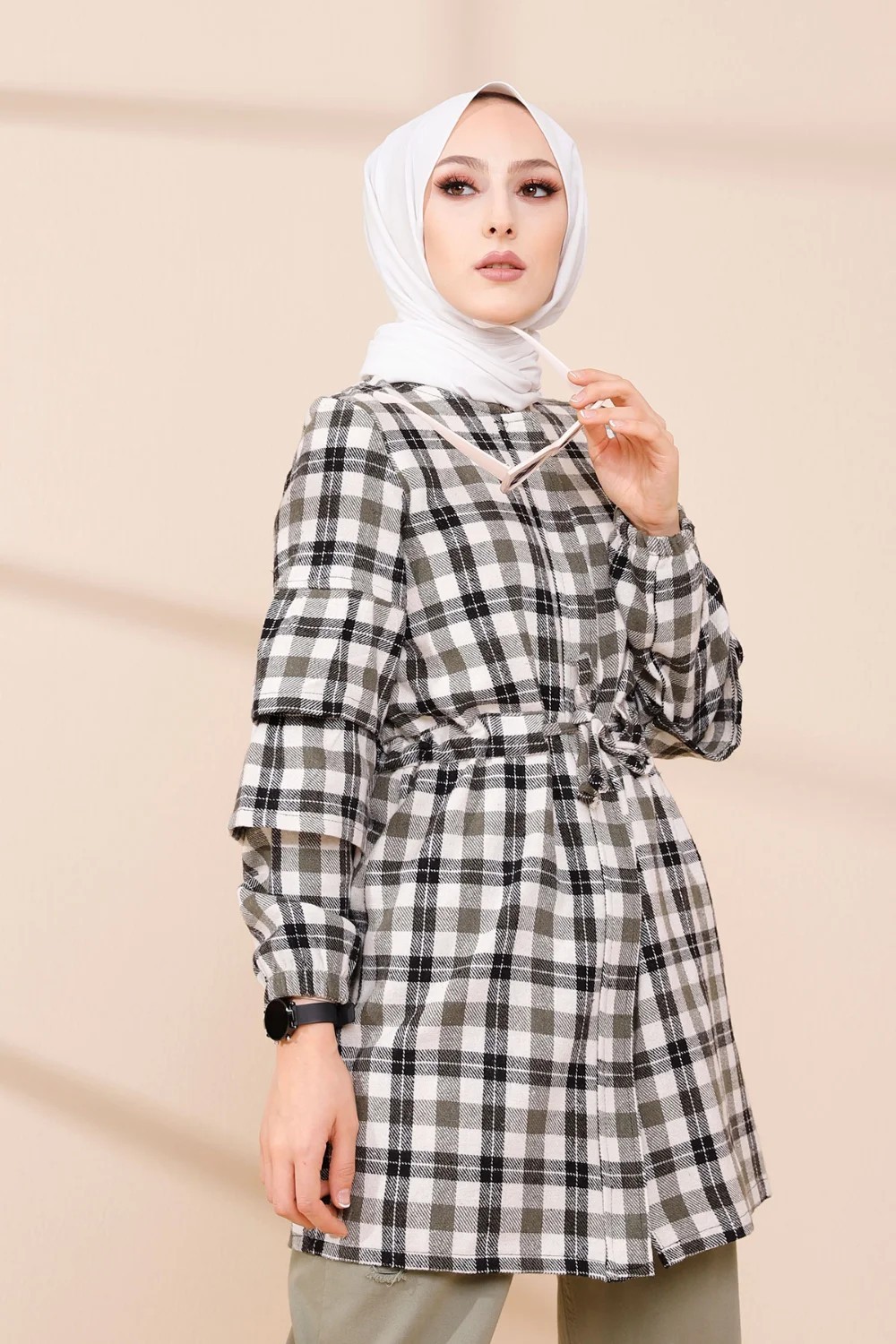 Veste-Tunique à carreaux (Tenue Hijab Hiver) - Couleur blanc et kaki Vetement & Accessoire