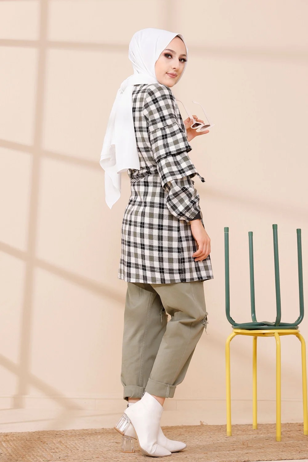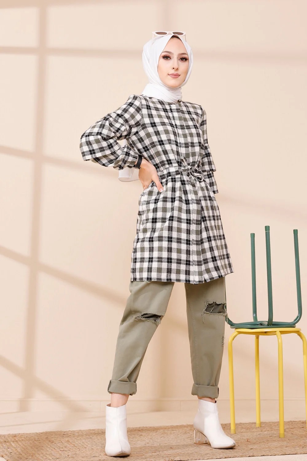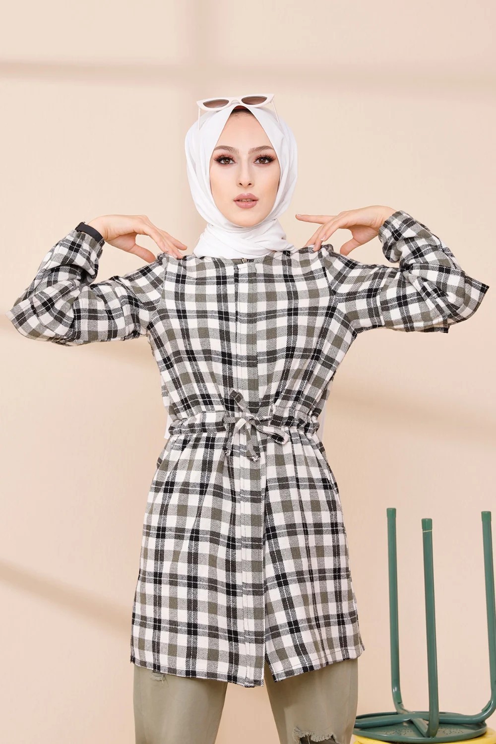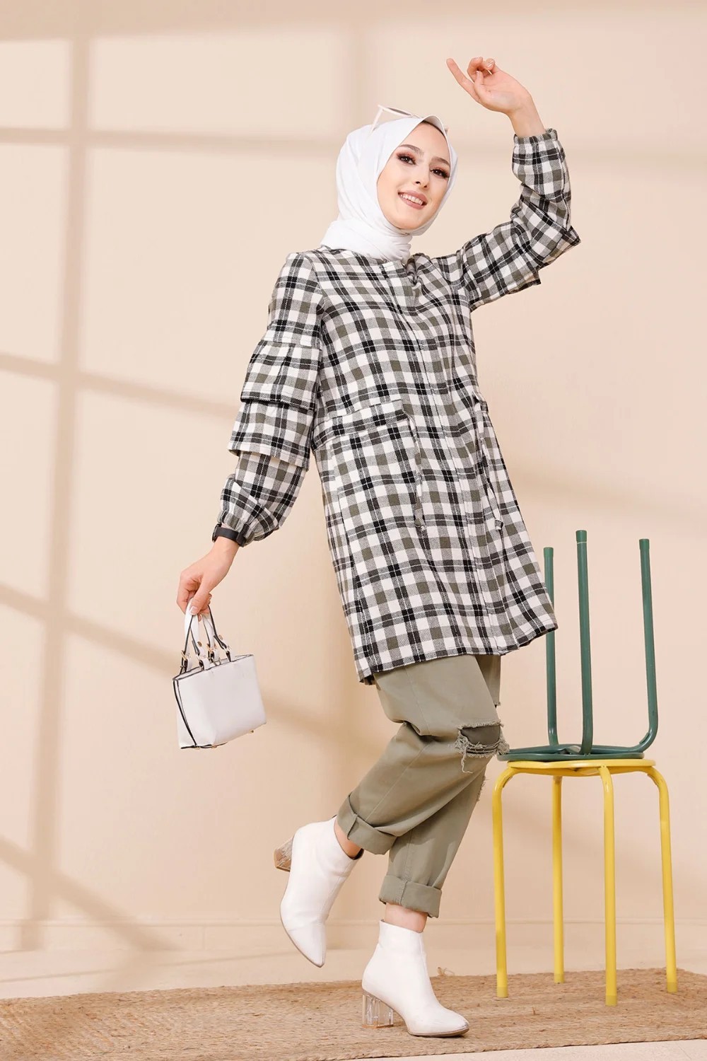 Chemisier à carreaux (Tenue Hijab Chic) - Couleur noir blanc et kaki - REF. 35654 (19.90 €)