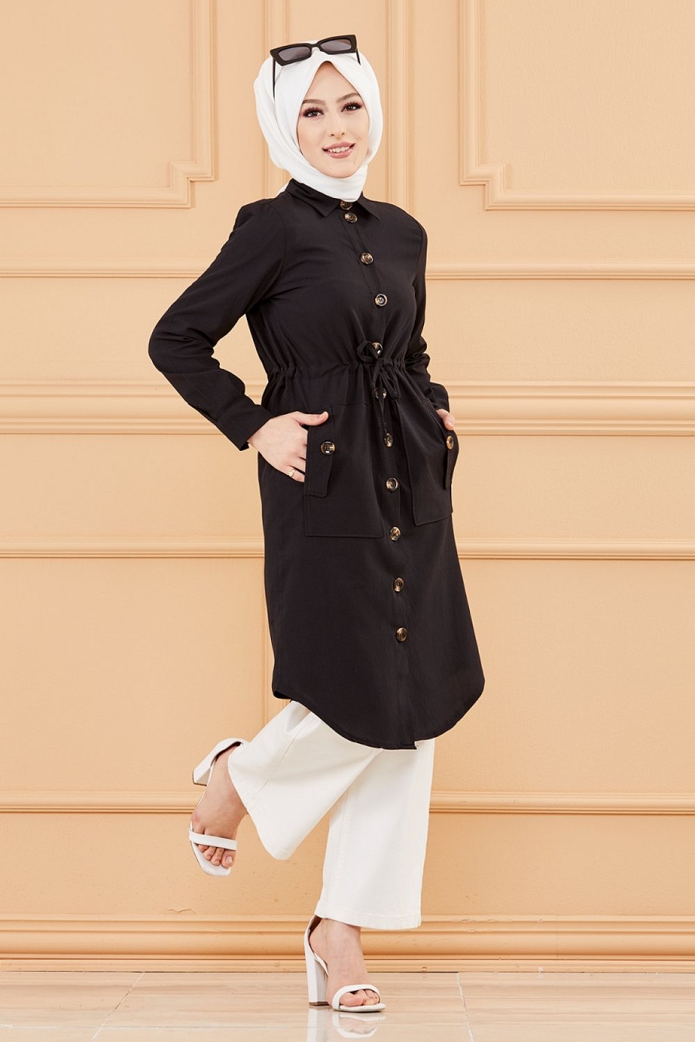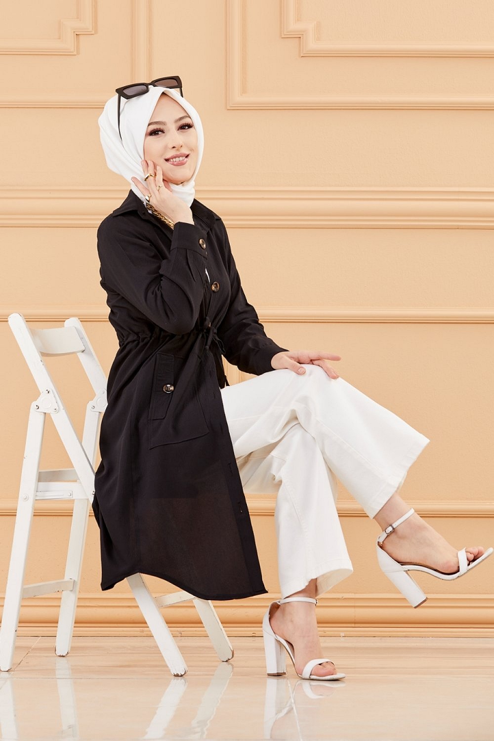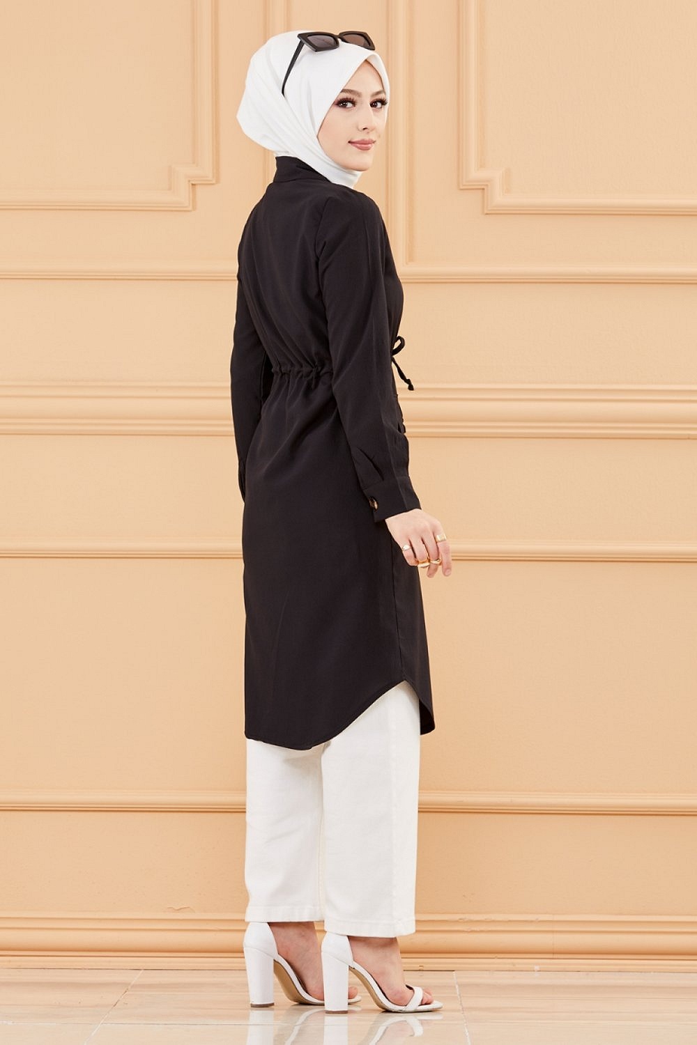 Veste - Tunique longue avec lien de serrage a la taille (Vetement femme voilee chic) - Couleur noir
