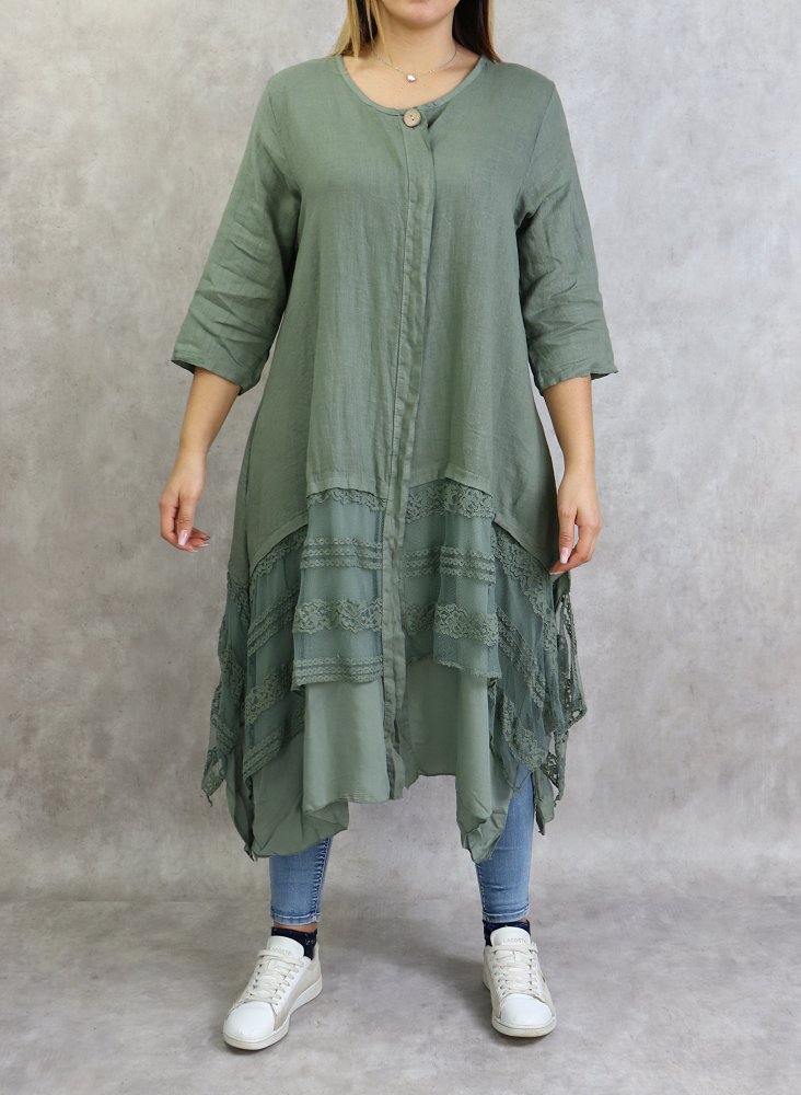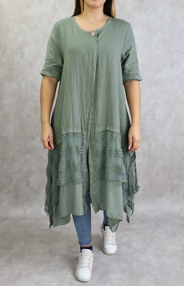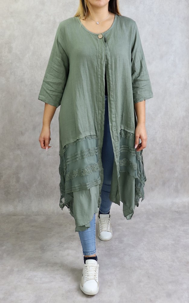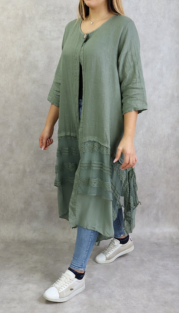 Veste mi longue, col rond, fermeture 1 bouton, manches 3/4, poches latérales. Coupe évasée, matière agréable et fluide, finition sur le bas d'une dentelle doublée.