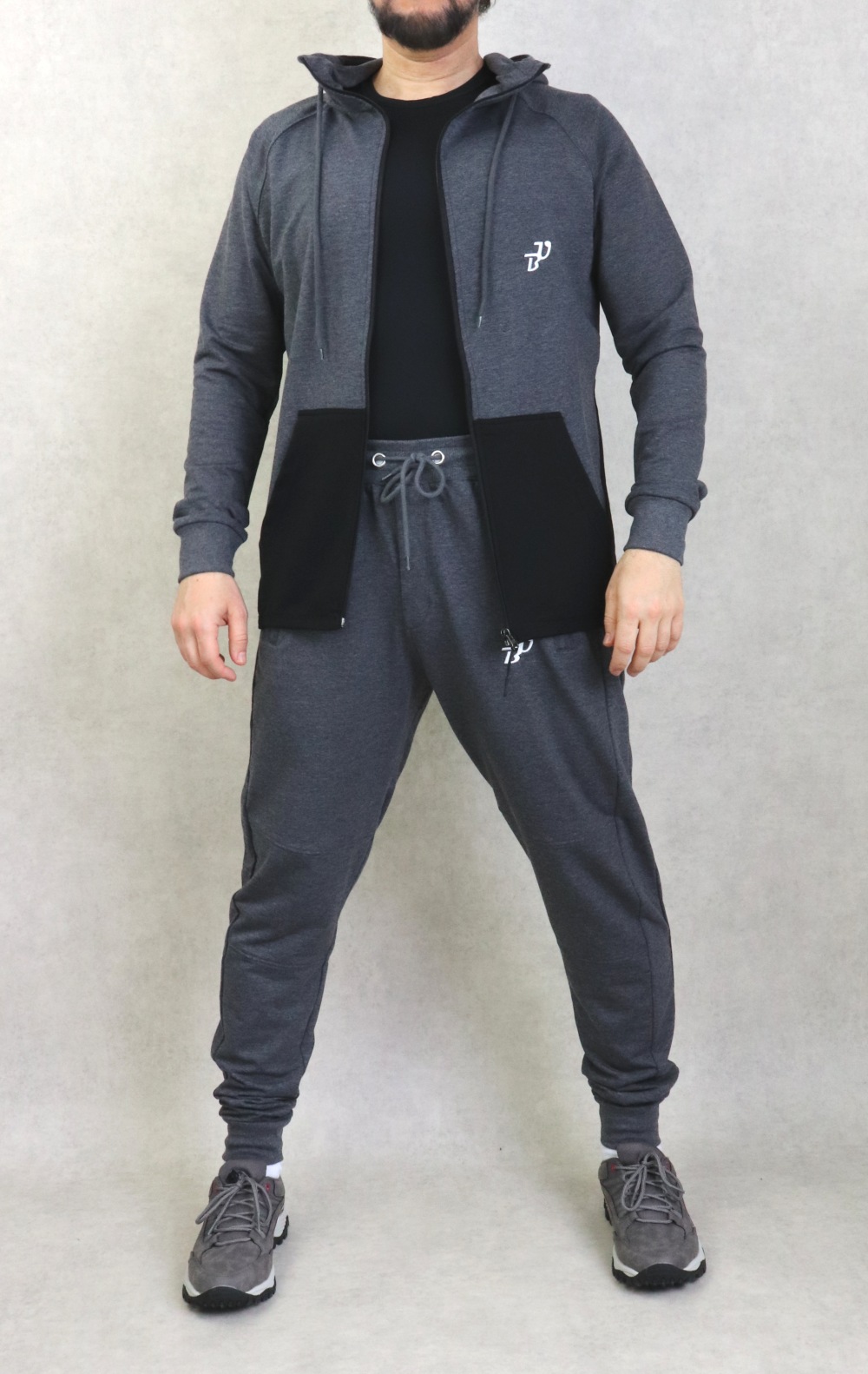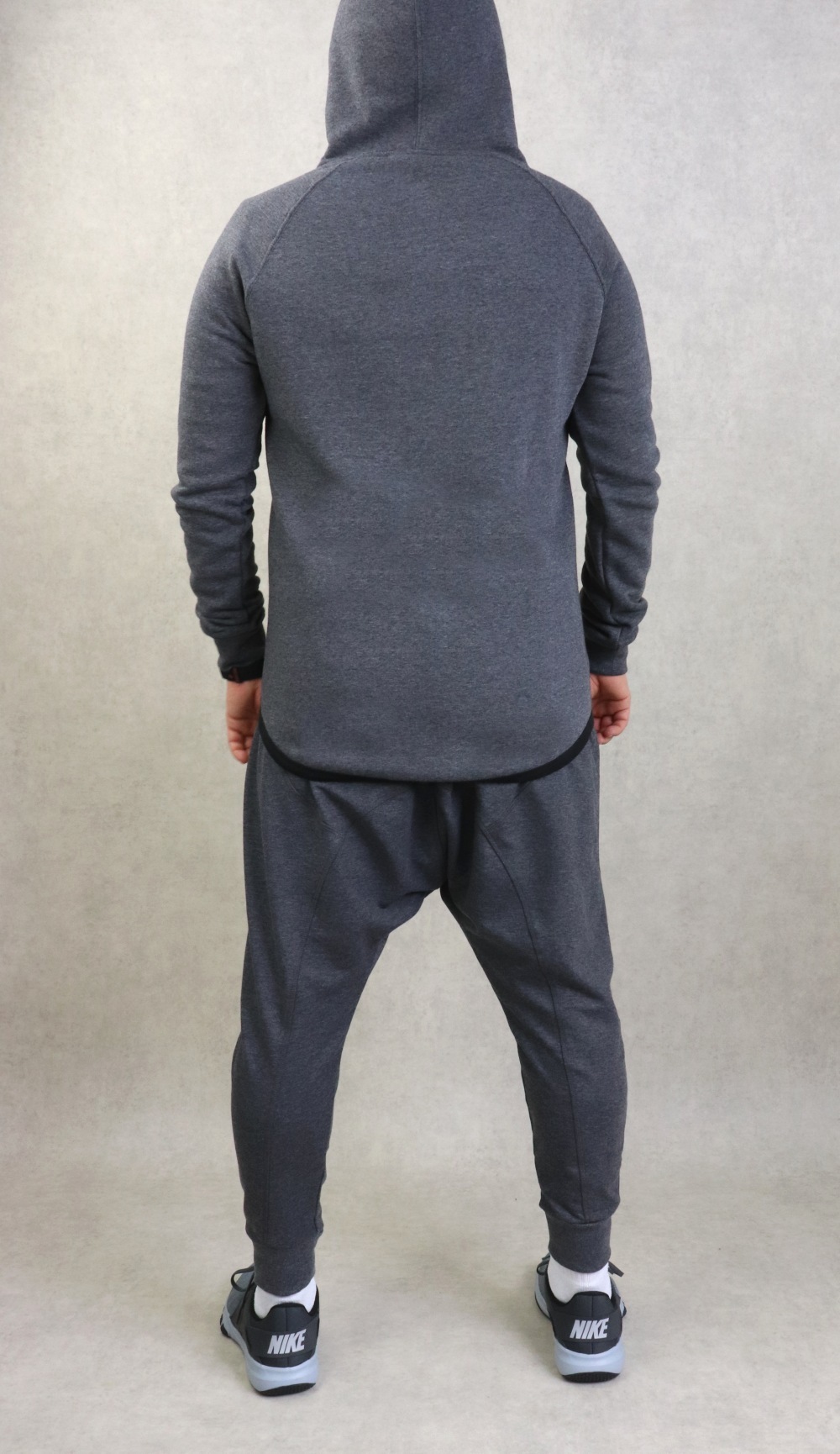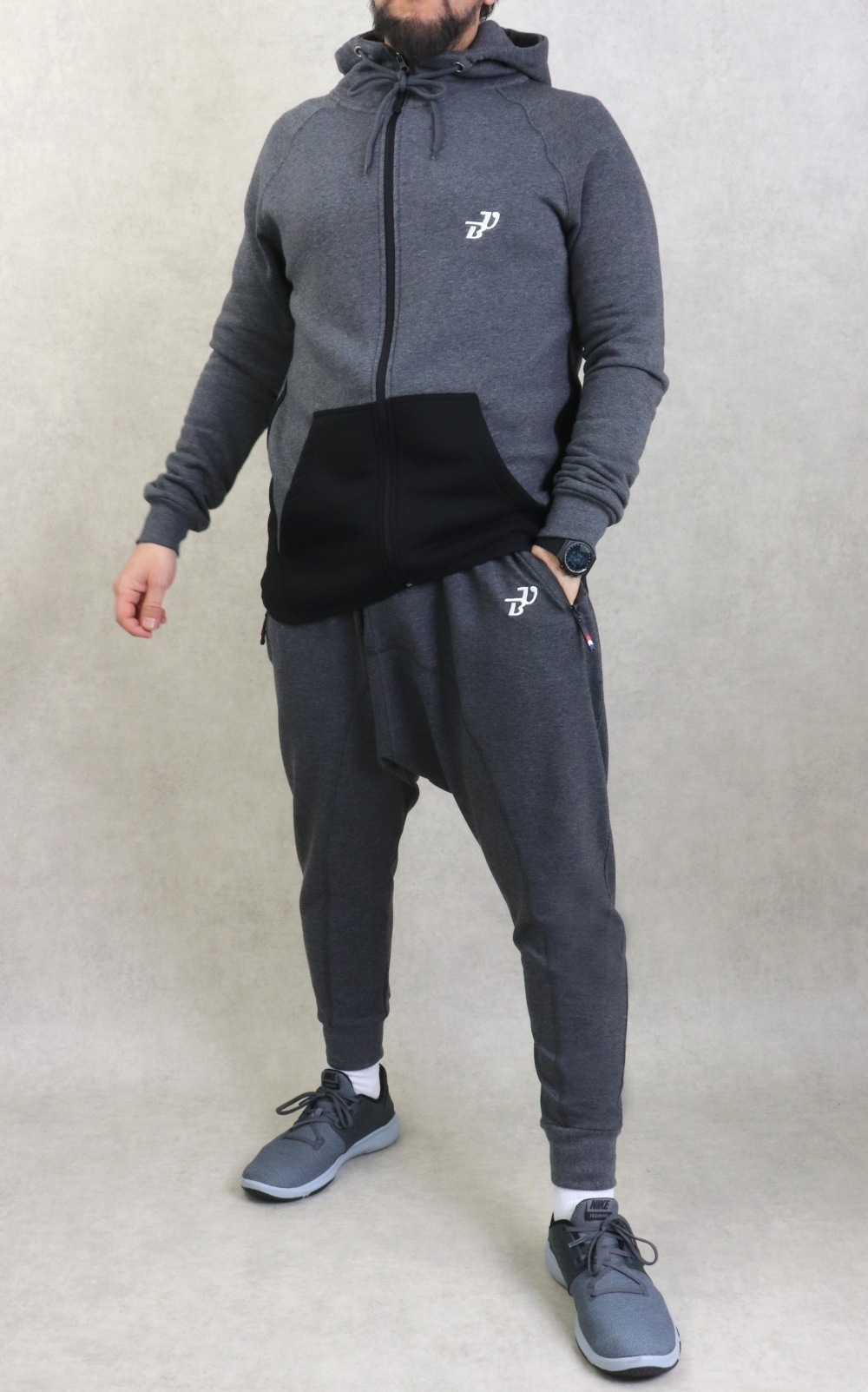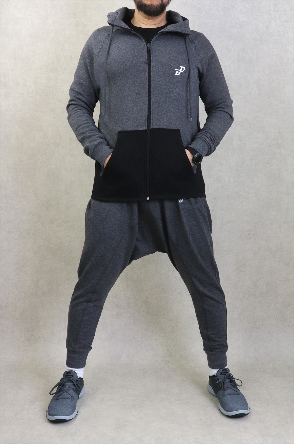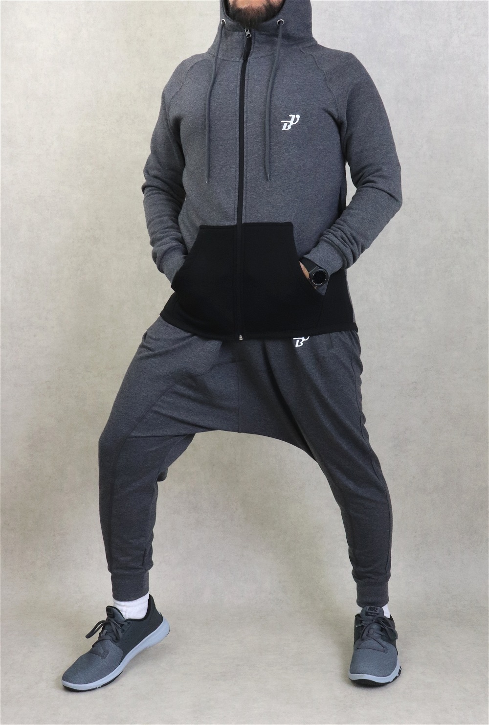 Veste bicolore grise et noire, plus longue à l'arrière qu'à l'avant. Tissu molletonné de qualité doux et qui tient chaud. Deux poches sur les côtés. Capuche doublée avec cordon.