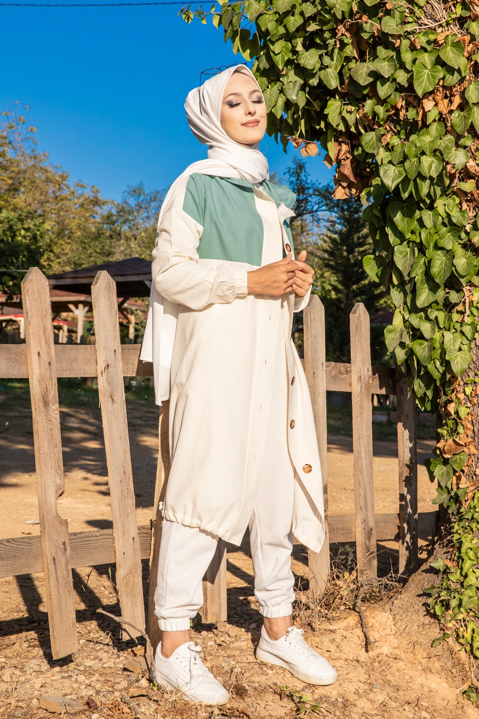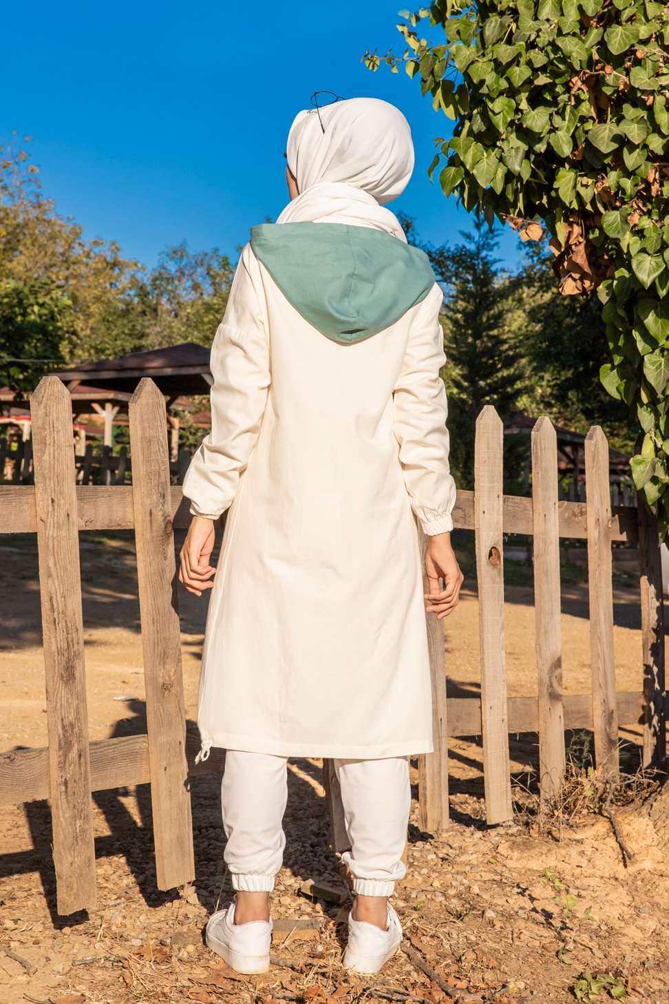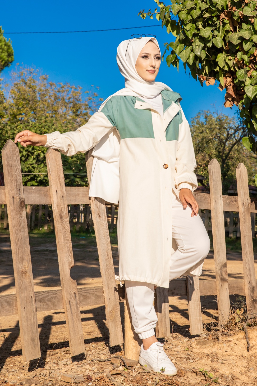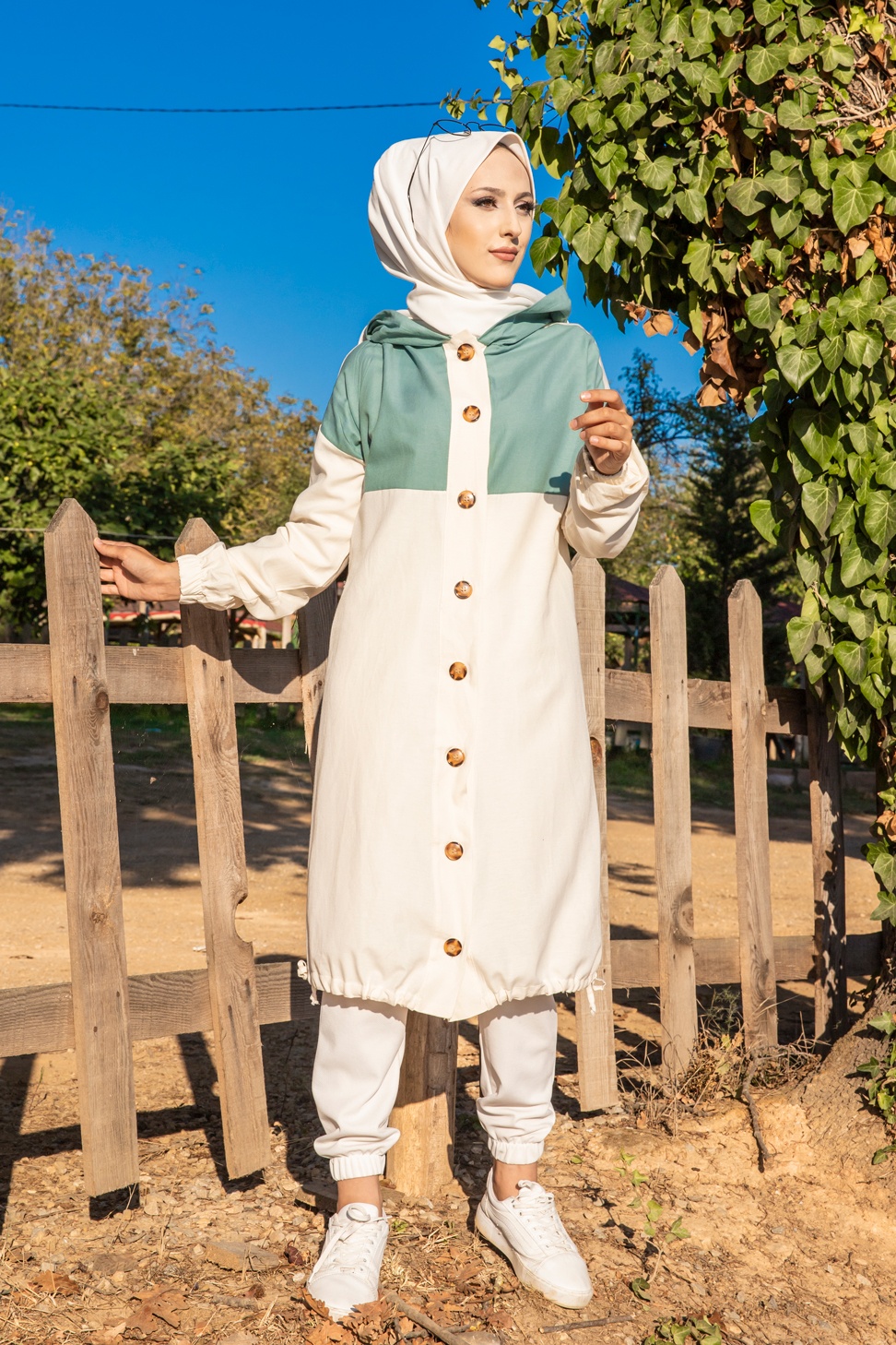 Veste longue bicolore à capuche (Casual Modest Fashion) - Couleur blanc et menthe Vetement & Accessoire