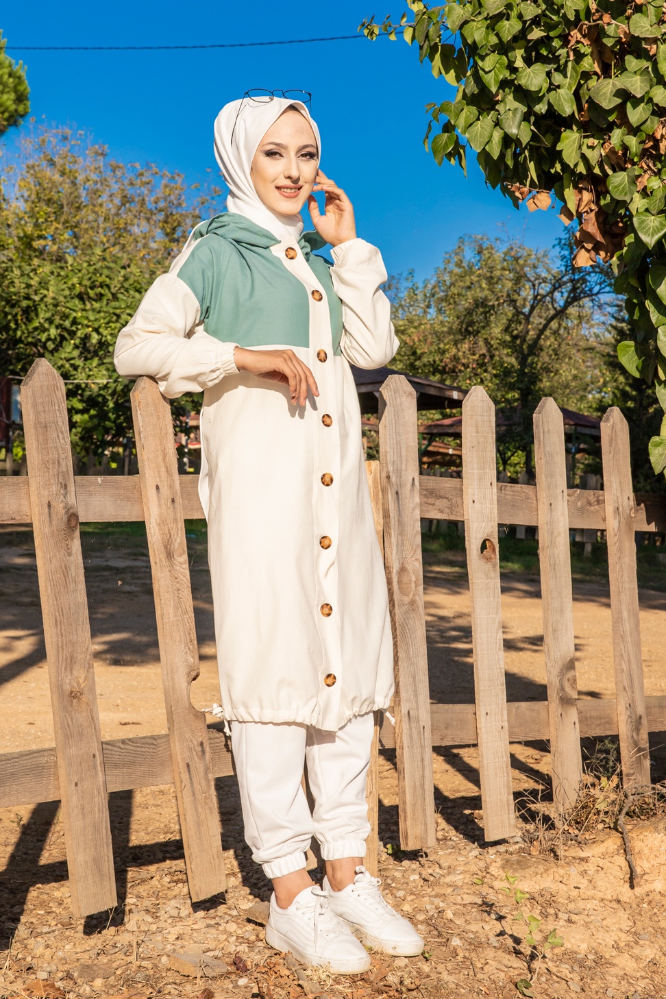 Veste longue bicolore a capuche (Casual Modest Fashion) - Couleur blanc et menthe