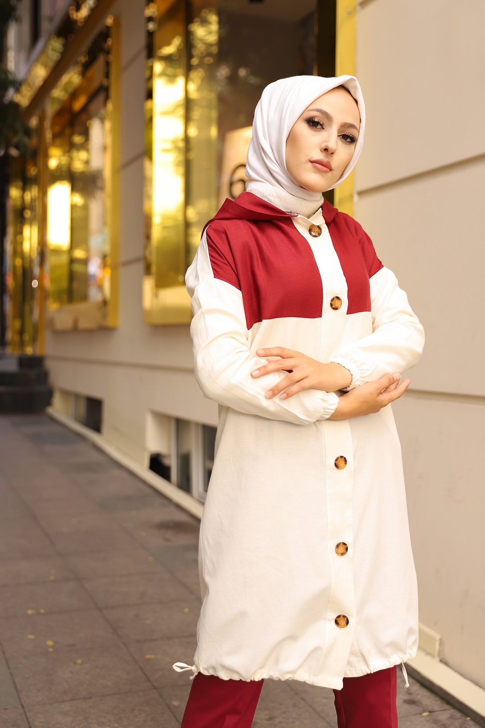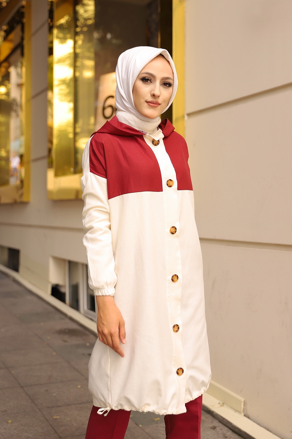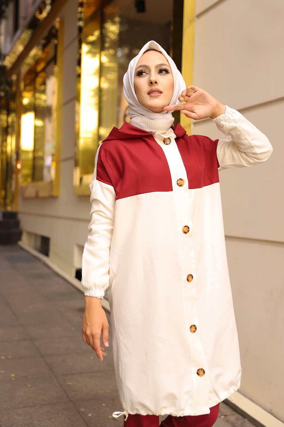Veste longue bicolore à capuche (Mode Musulmane) - Couleur blanc et bordeaux Vetement & Accessoire