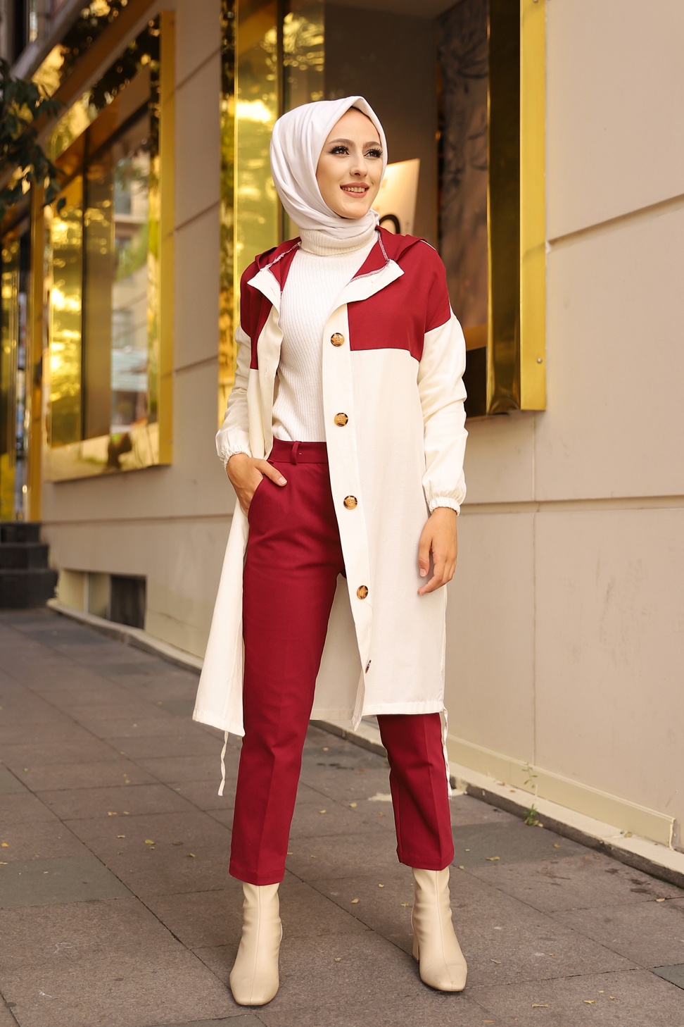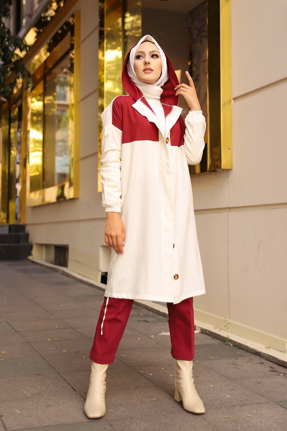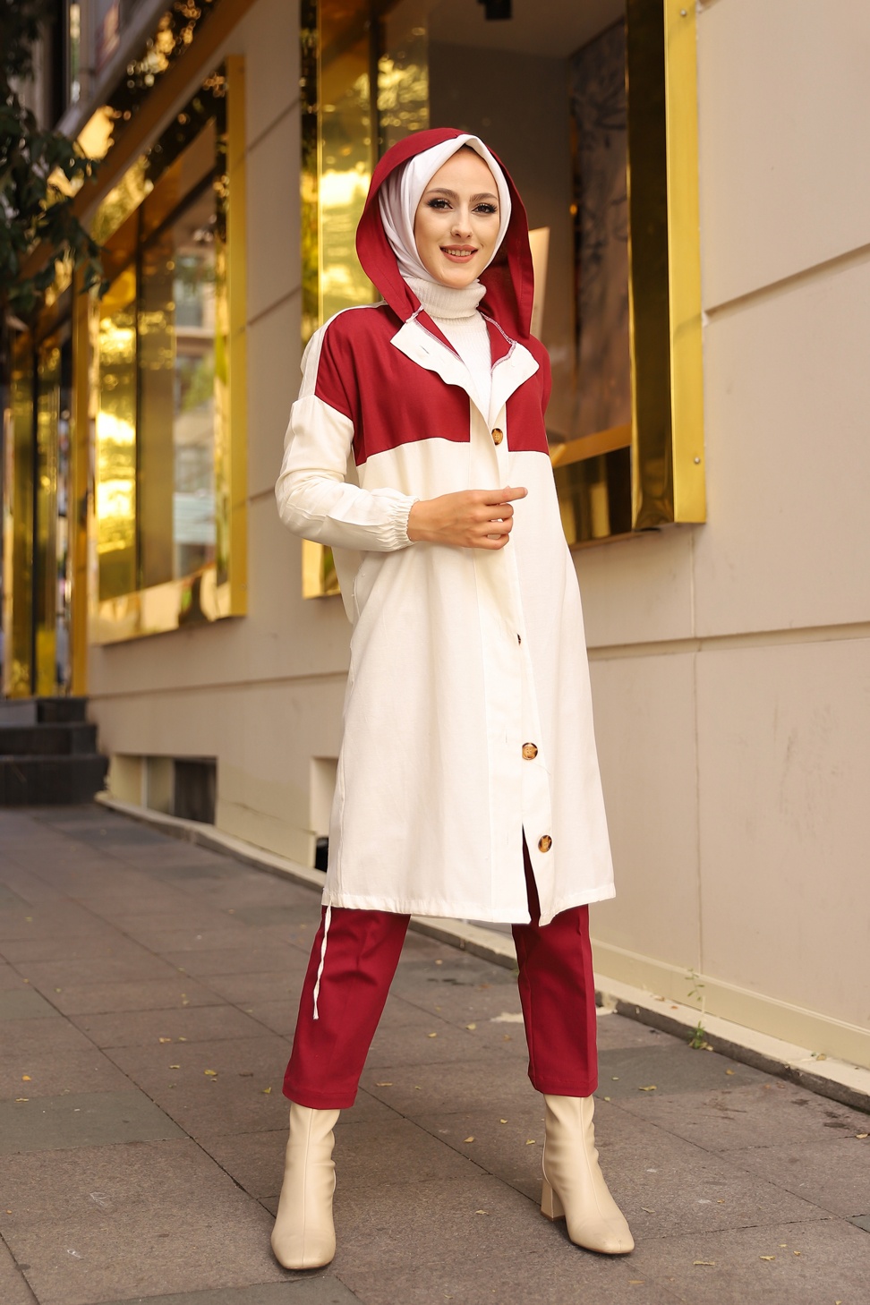 Veste longue bicolore à capuche (Mode Musulmane) - Couleur blanc et bordeaux Vetement & Accessoire