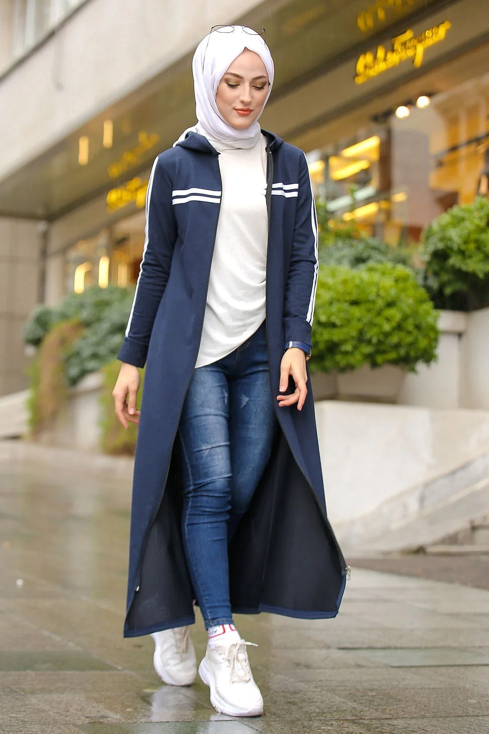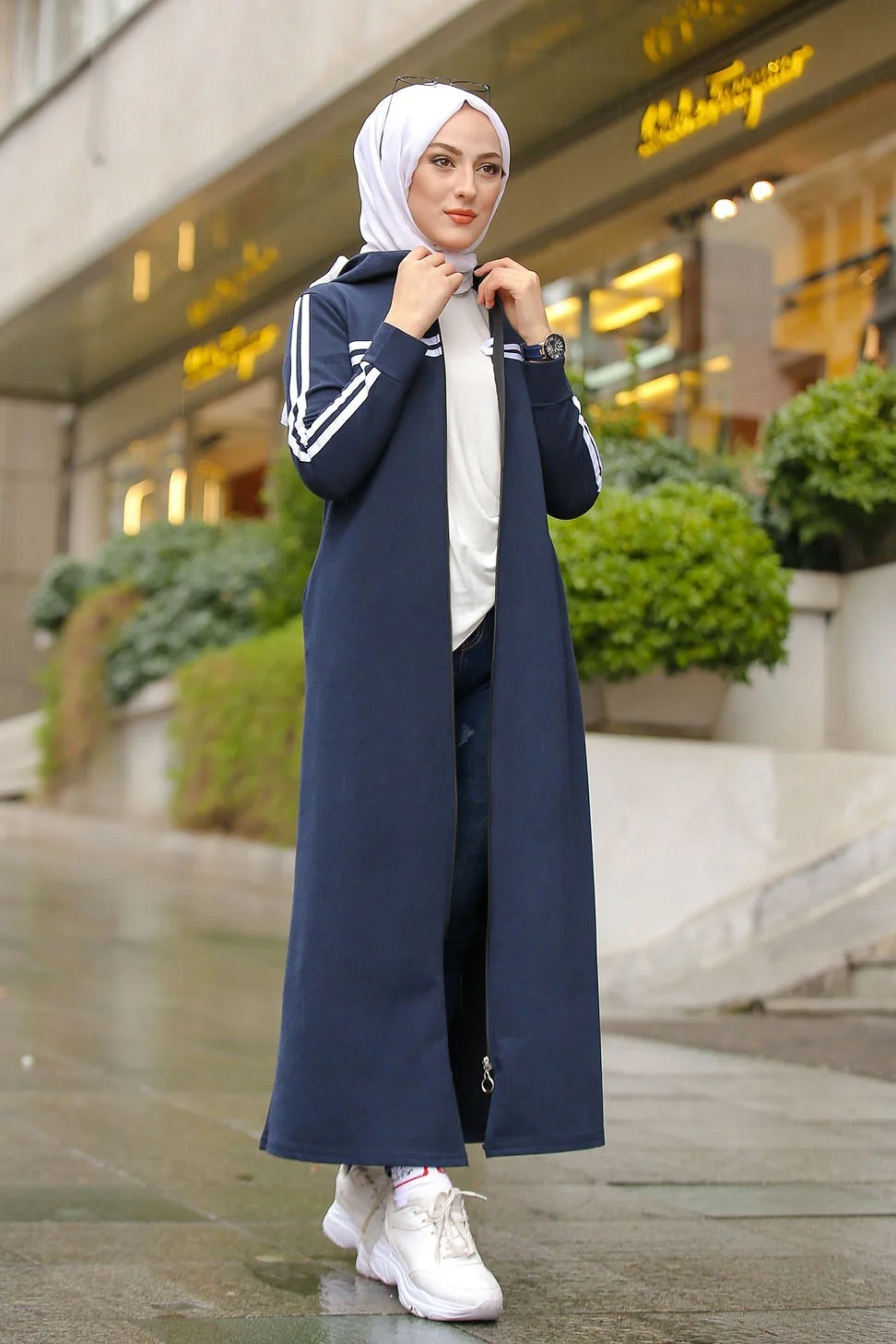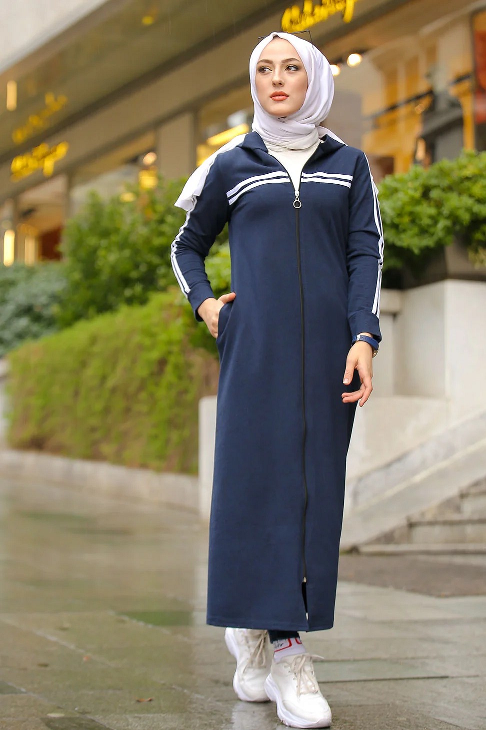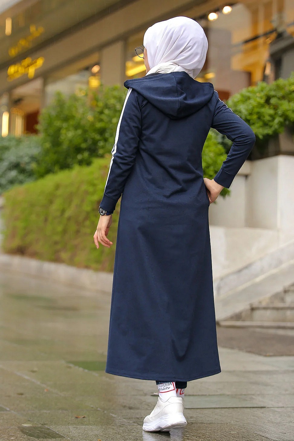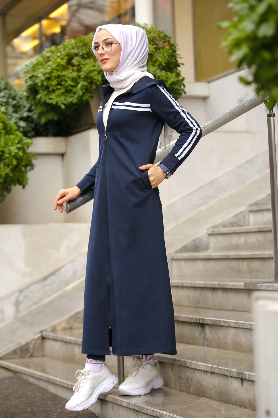 Veste longue zippée style sportswear (Robe Sport pour femme voilée) - Couleur bleu marine Vetement & Accessoire