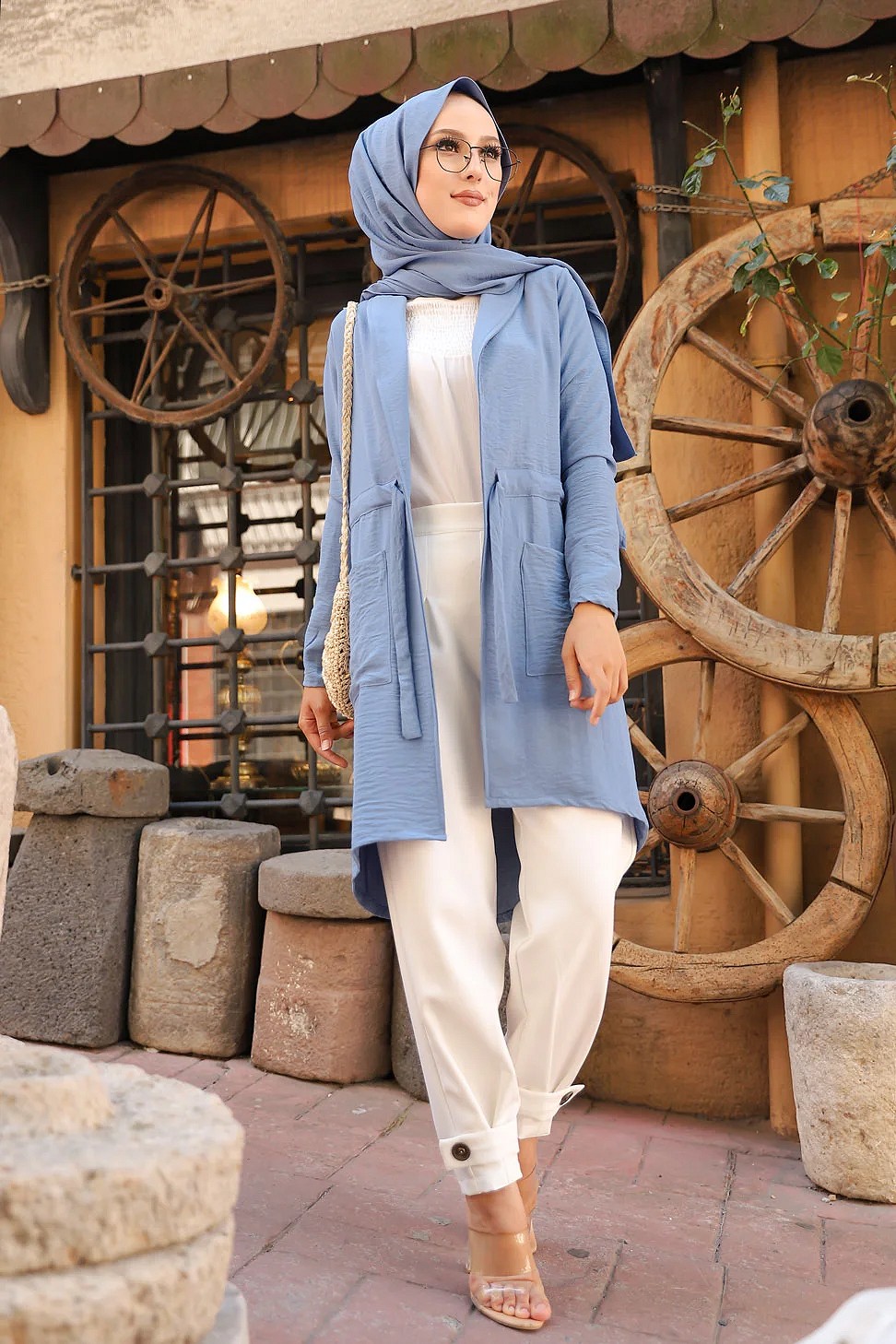Veste mi longue, col tailleur, 2 poches plaquées, ceinture intégrée, tissu effet crêpe.