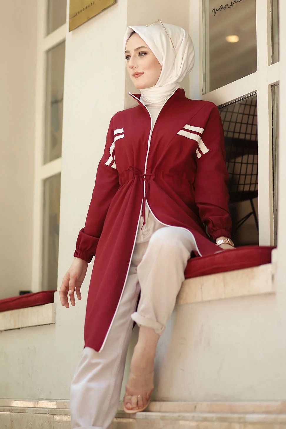 Modèle type sportswear au look moderne et décontracté, pièce maîtresse du dressing Modest Fashion pour la hijabia moderne. Petite touche design avec deux bandes blanches et sa ceinture attache intégrée.