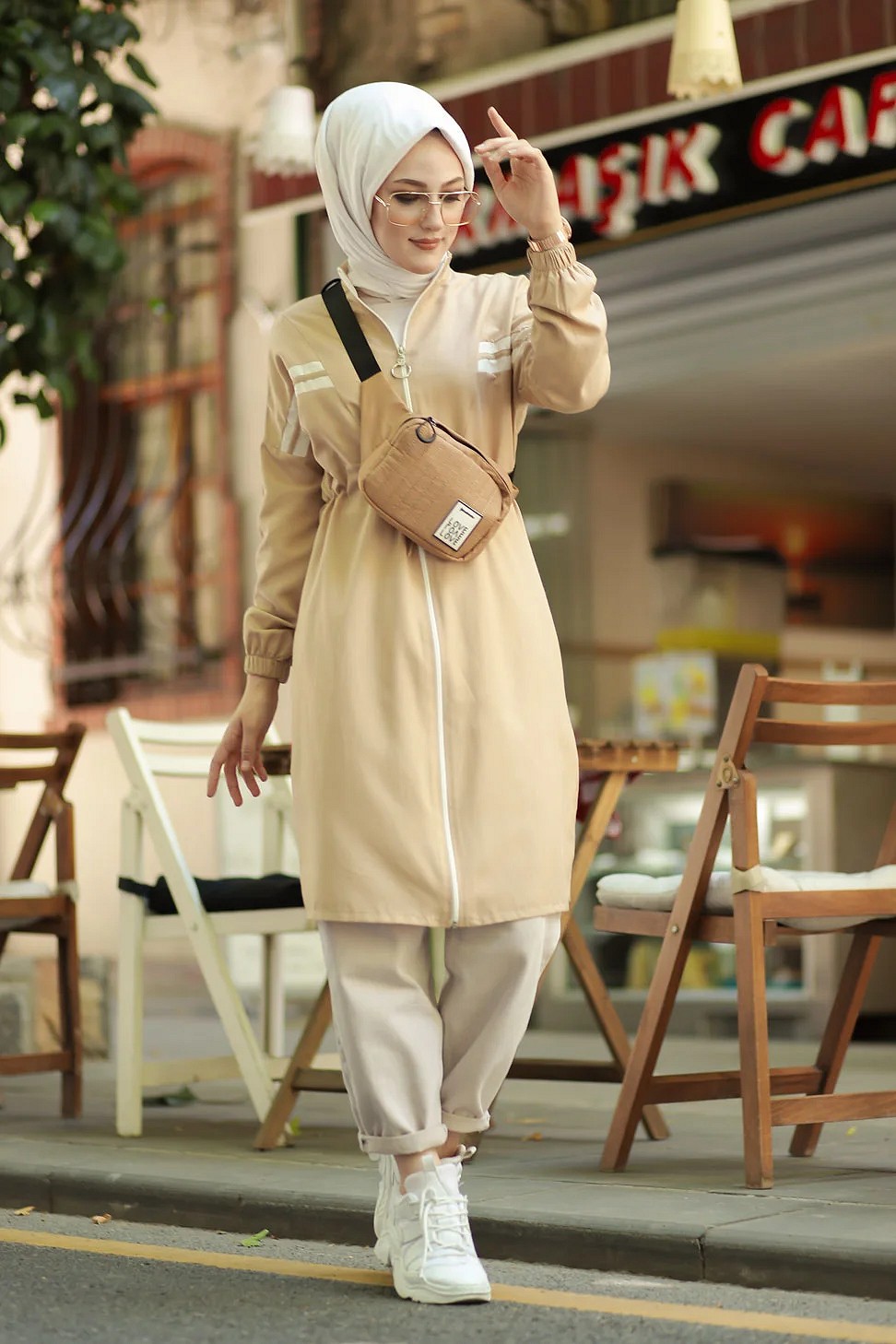 Veste moderne style décontracté avec fermeture zip (Vetement femme voilée) - Couleur beige Vetement & Accessoire