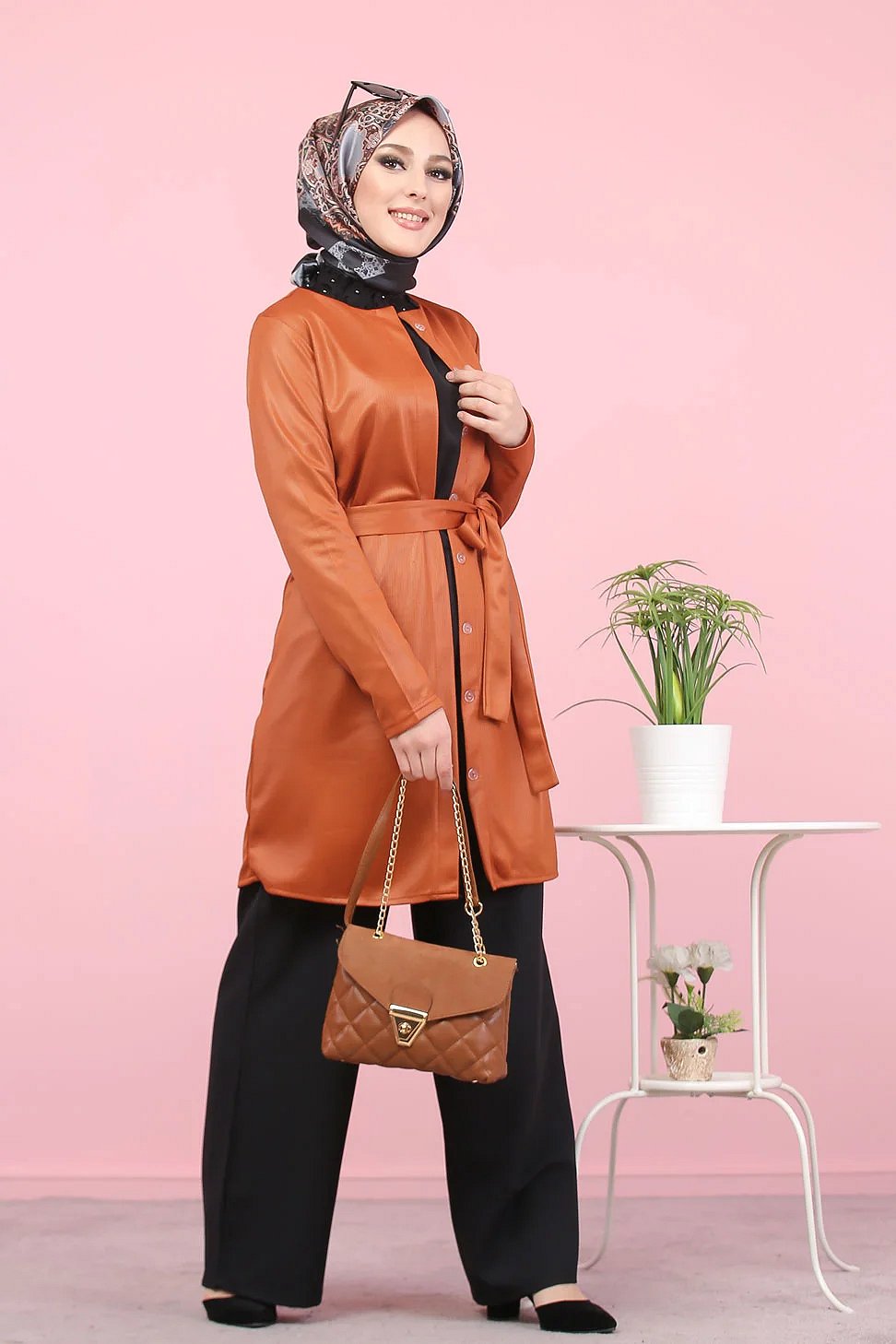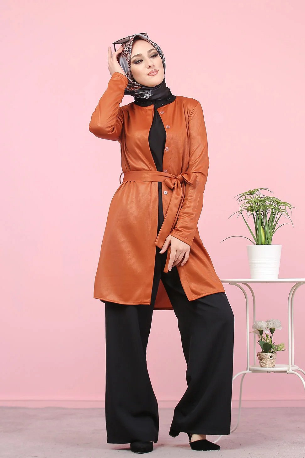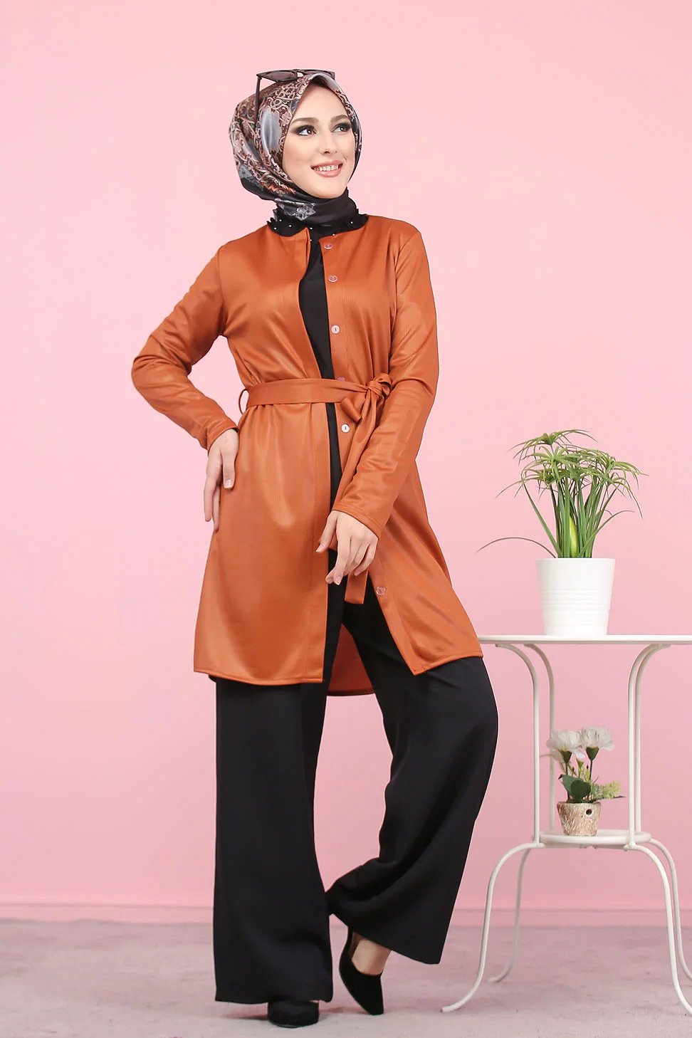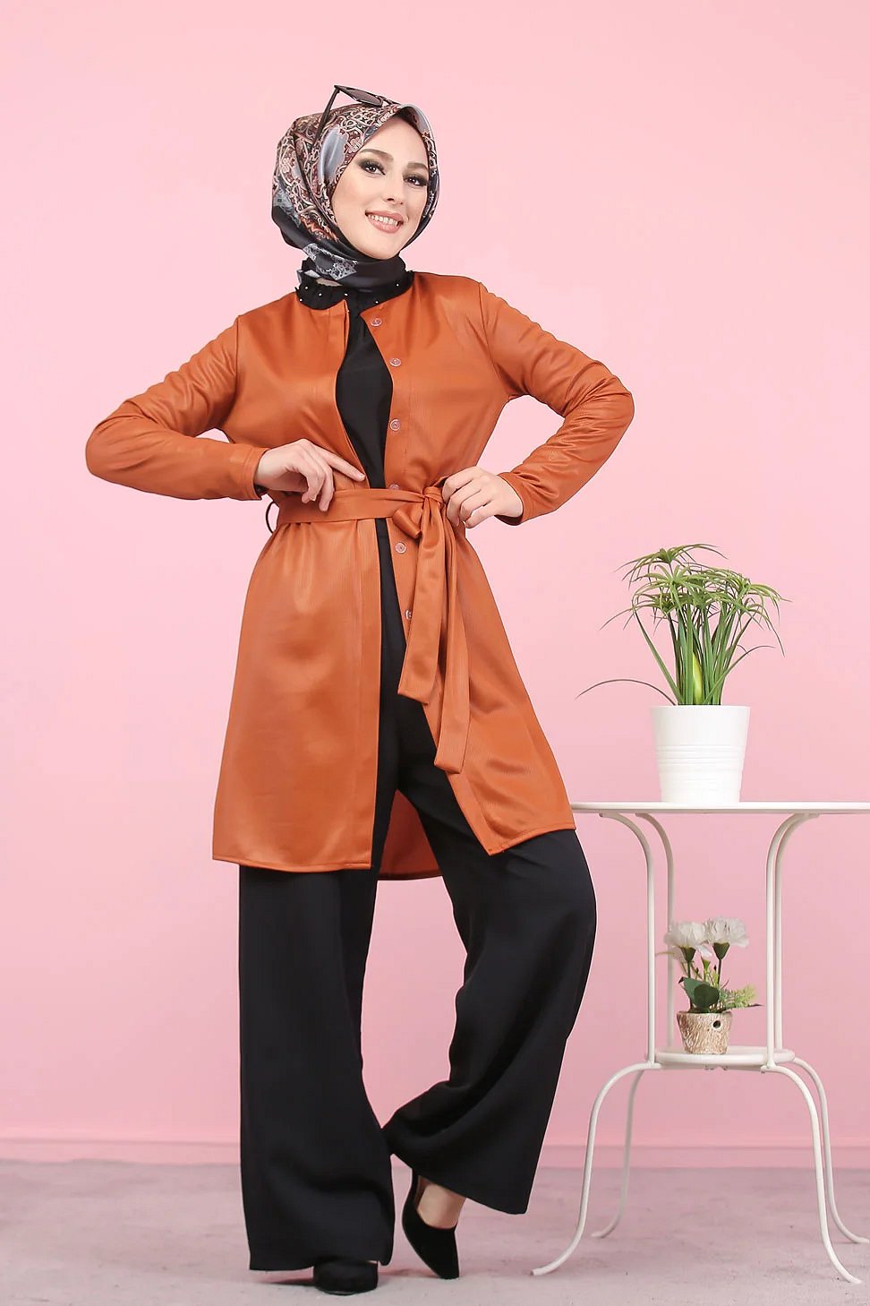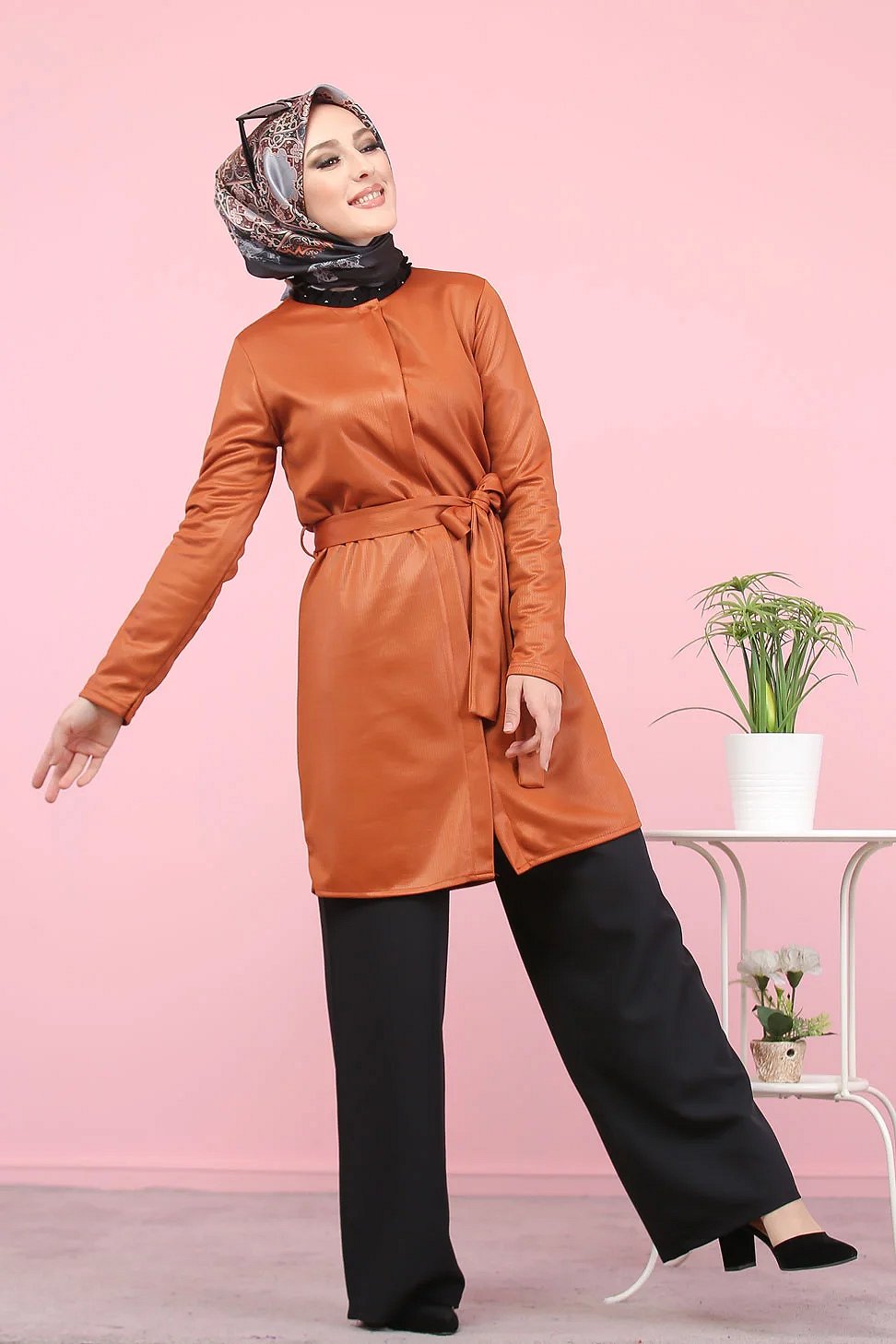 Veste-tunique satinée à ceinture pour femme (Mode musulmane en ligne pas cher) - Couleur rouille Vetement & Accessoire