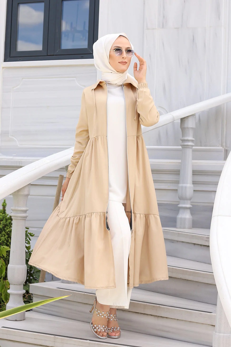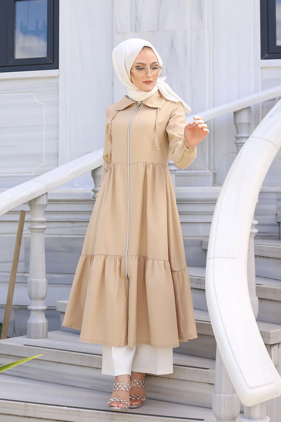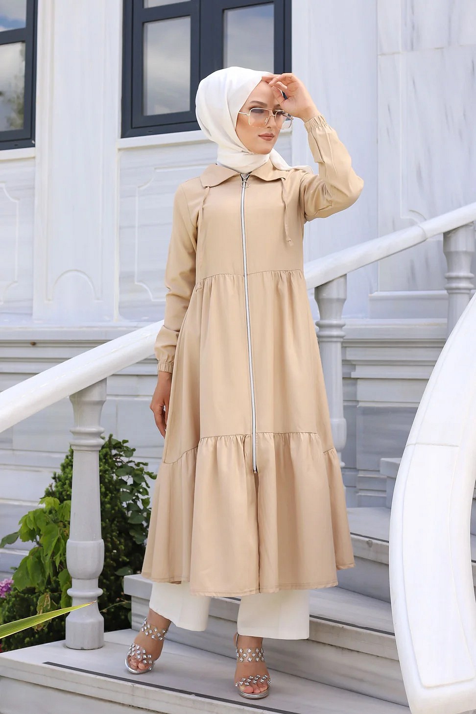 Veste zippée légère ample et évasée mi longue (Vetement mastour pour femme voilée) - Couleur beige Vetement & Accessoire