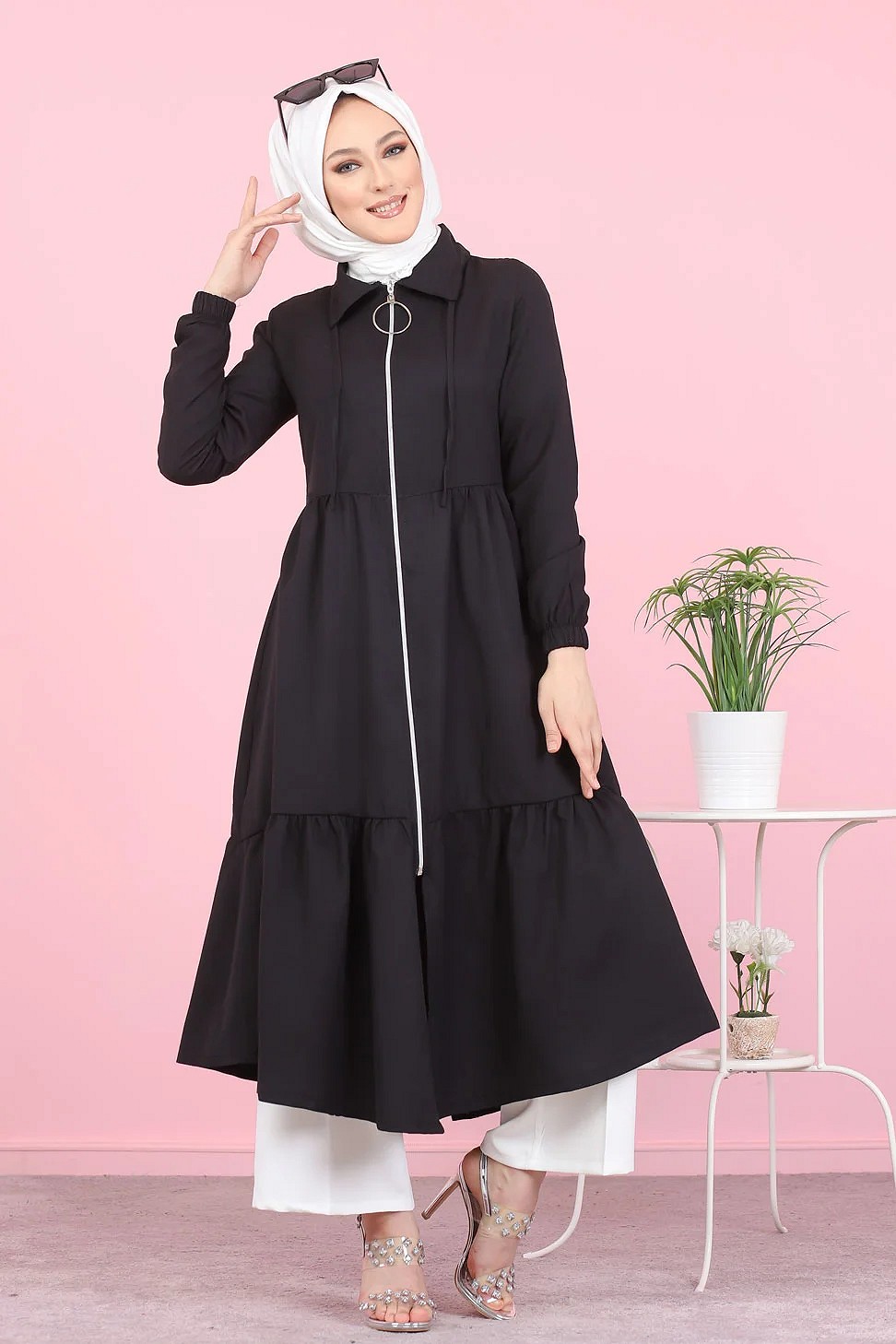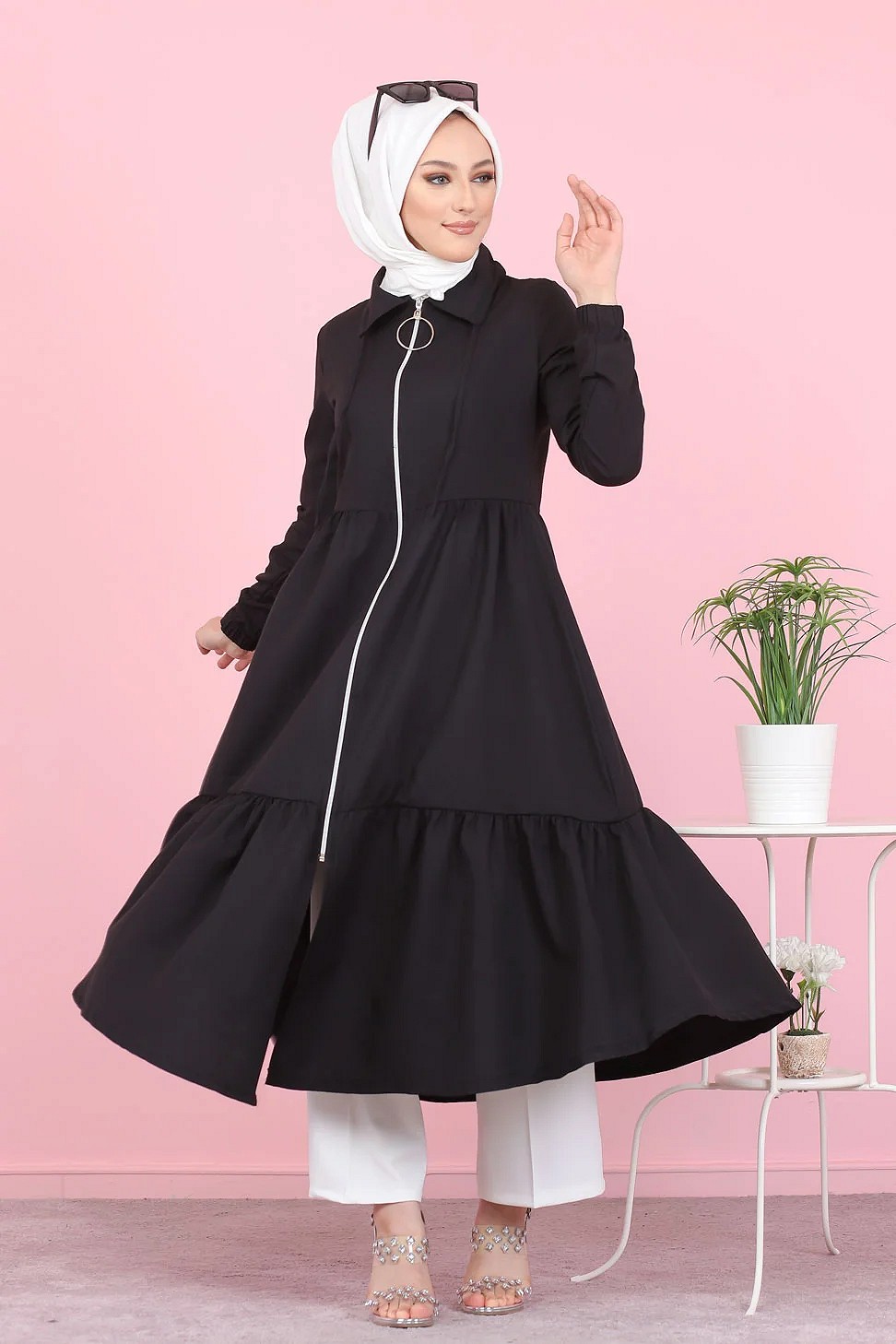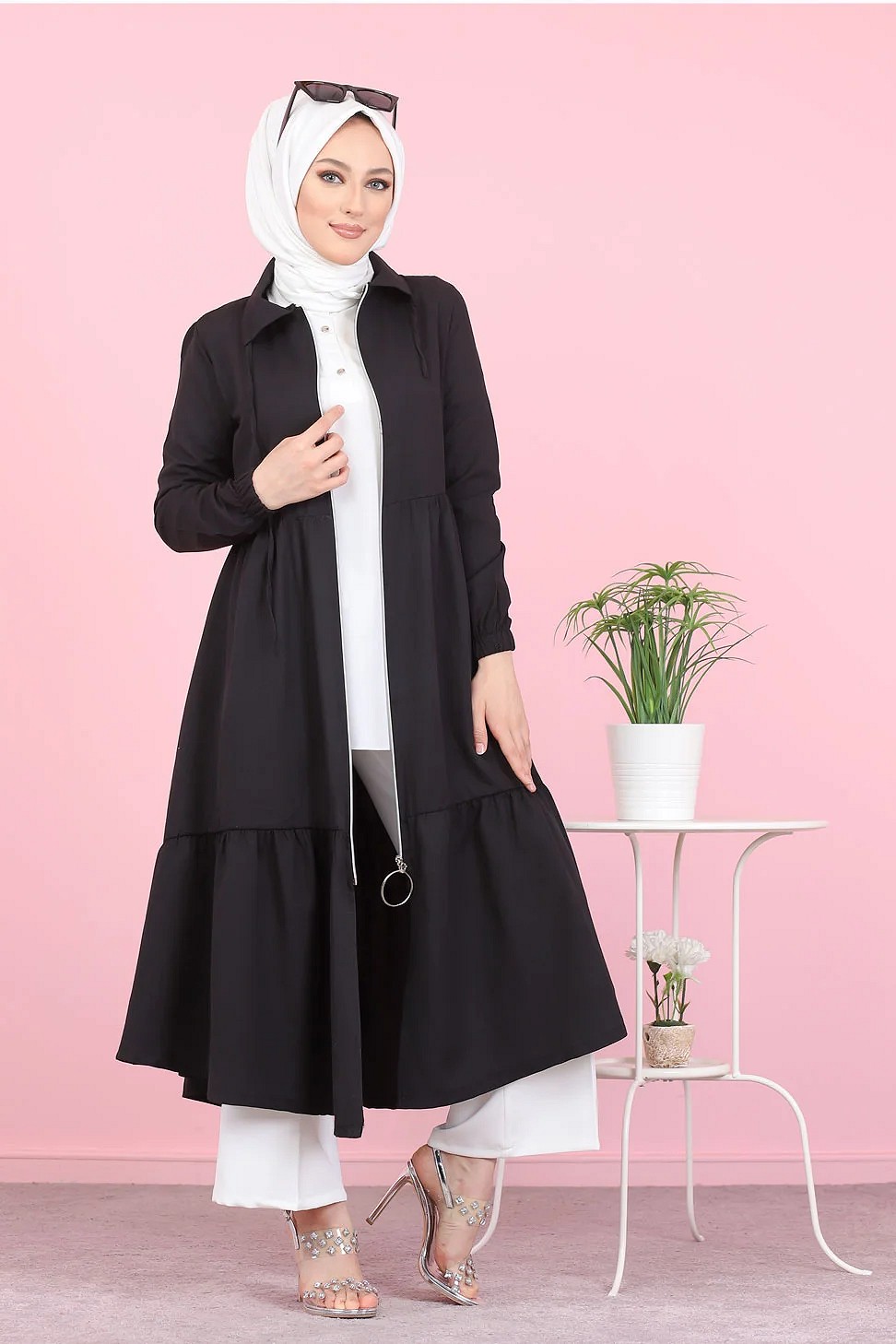 Veste zippée mi longue évasée (Vetement ample pour femme voilée) - Couleur noir Vetement & Accessoire