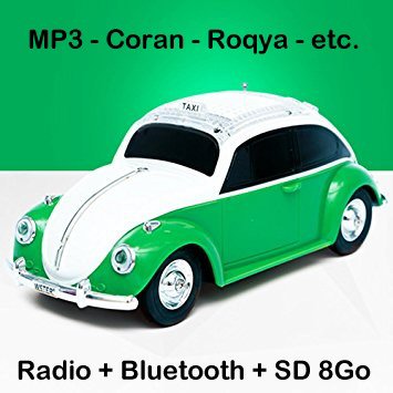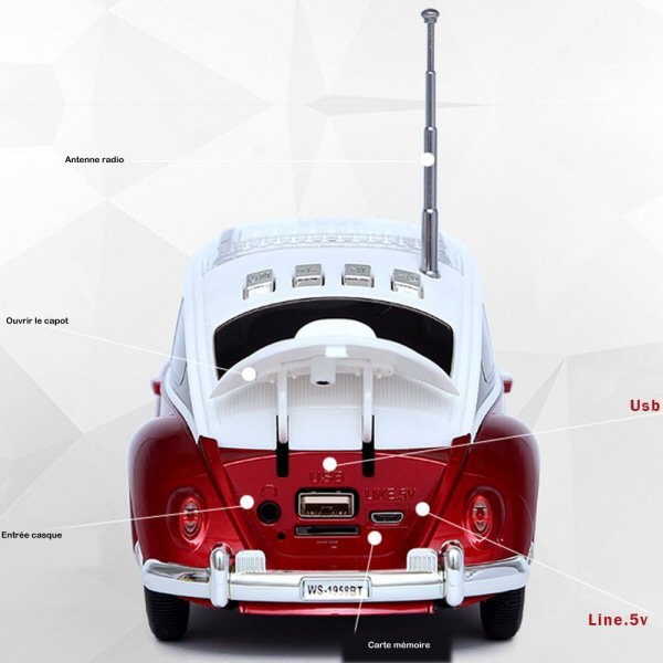 Un lecteur MP3 sous forme de voiture coccinelle avec lumières et effets sonores, hauts parleurs intégrés. Fonction bluetooth main libre...