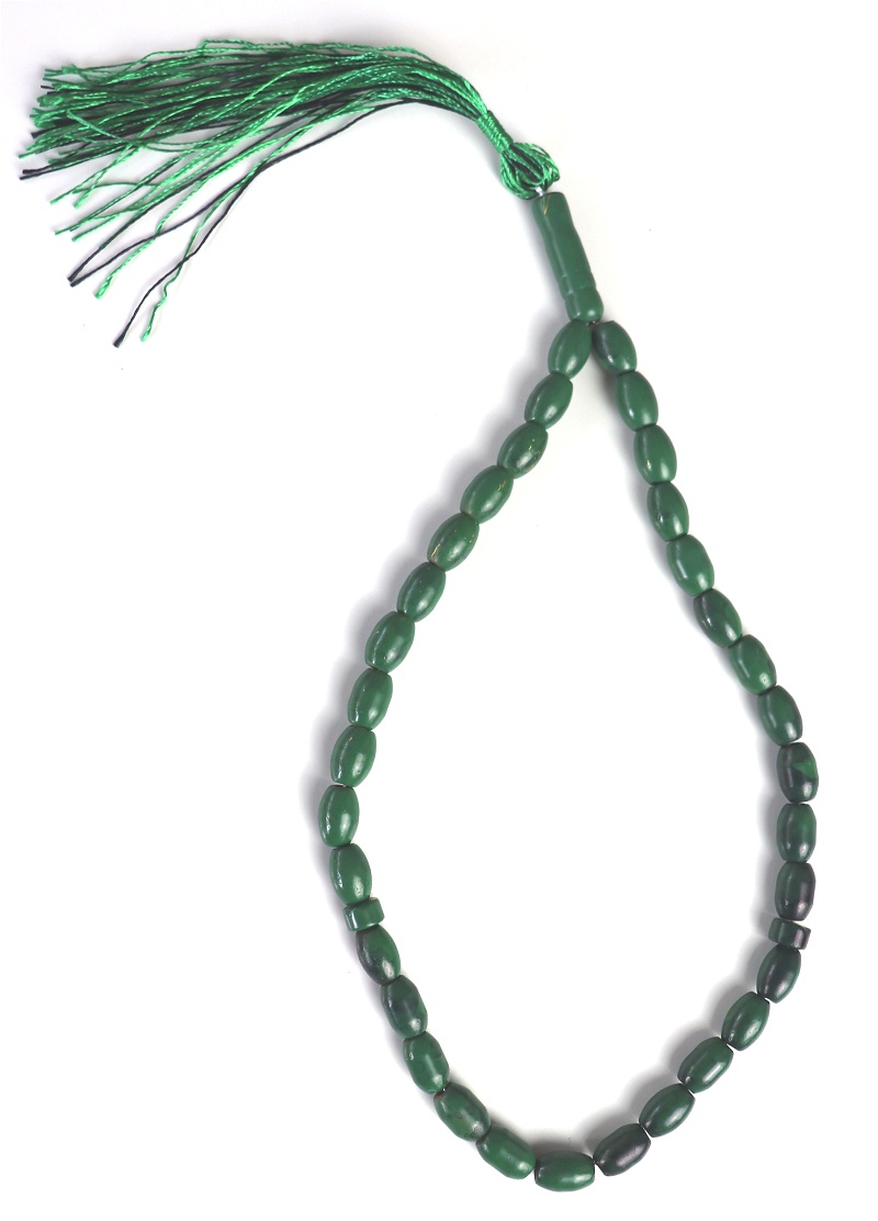 Chapelet 33 grains (perles ovales en verre) de couleur vert, avec séparateur tous les 11 grains.