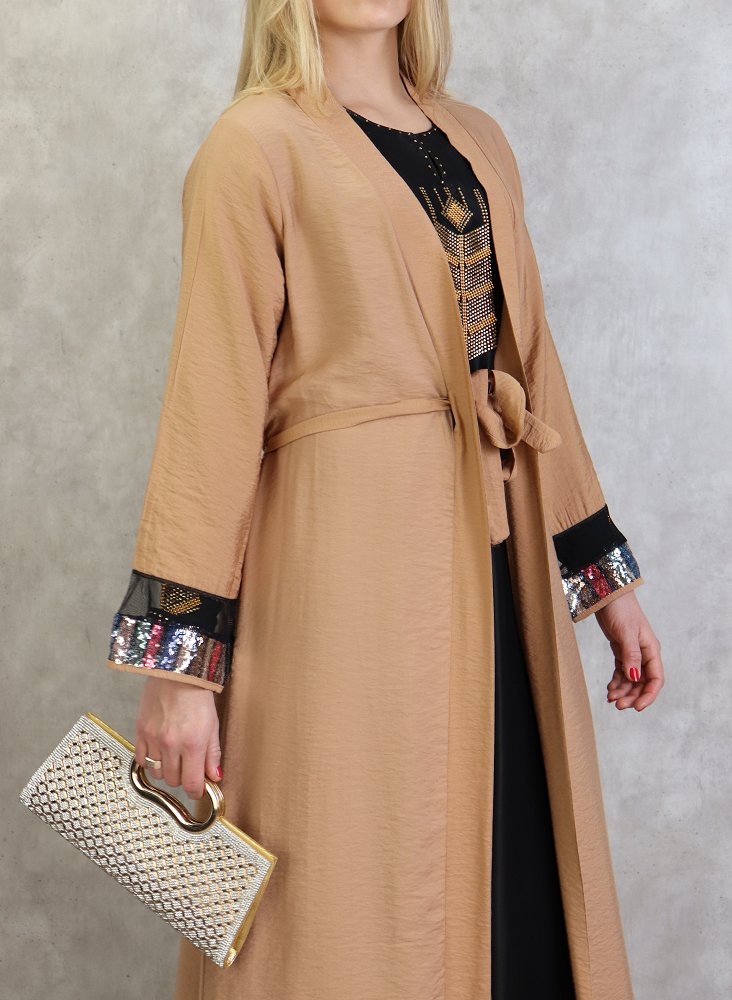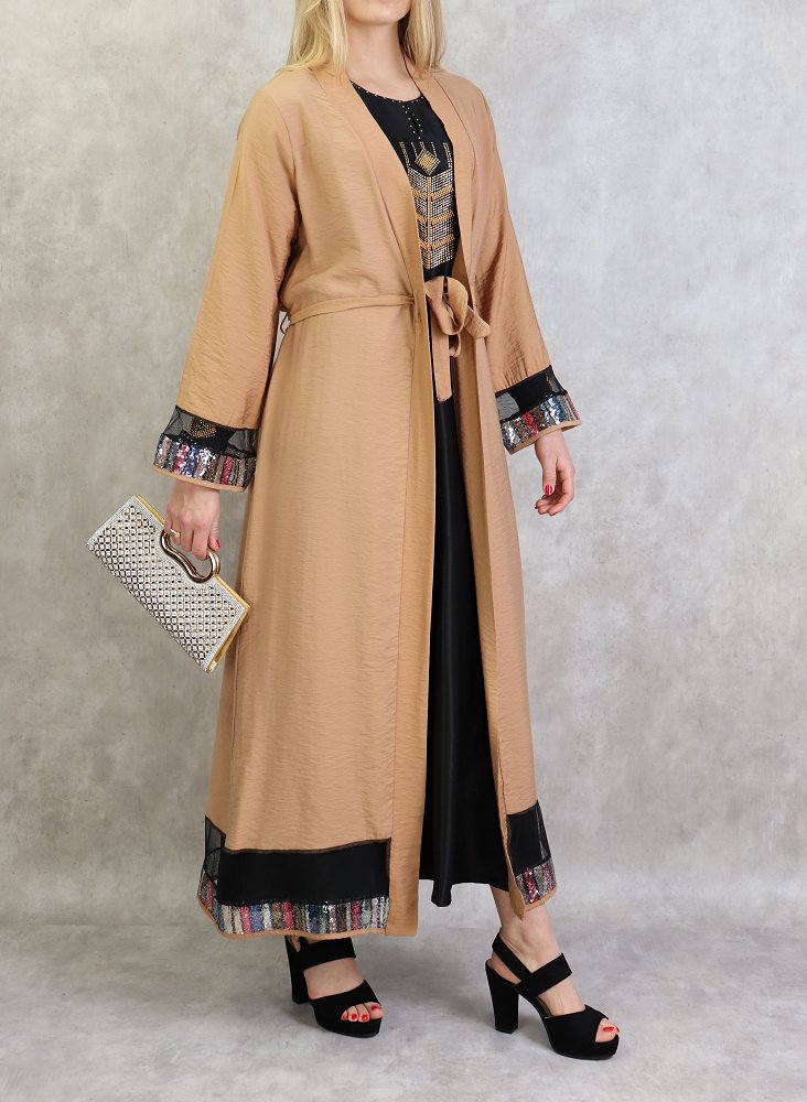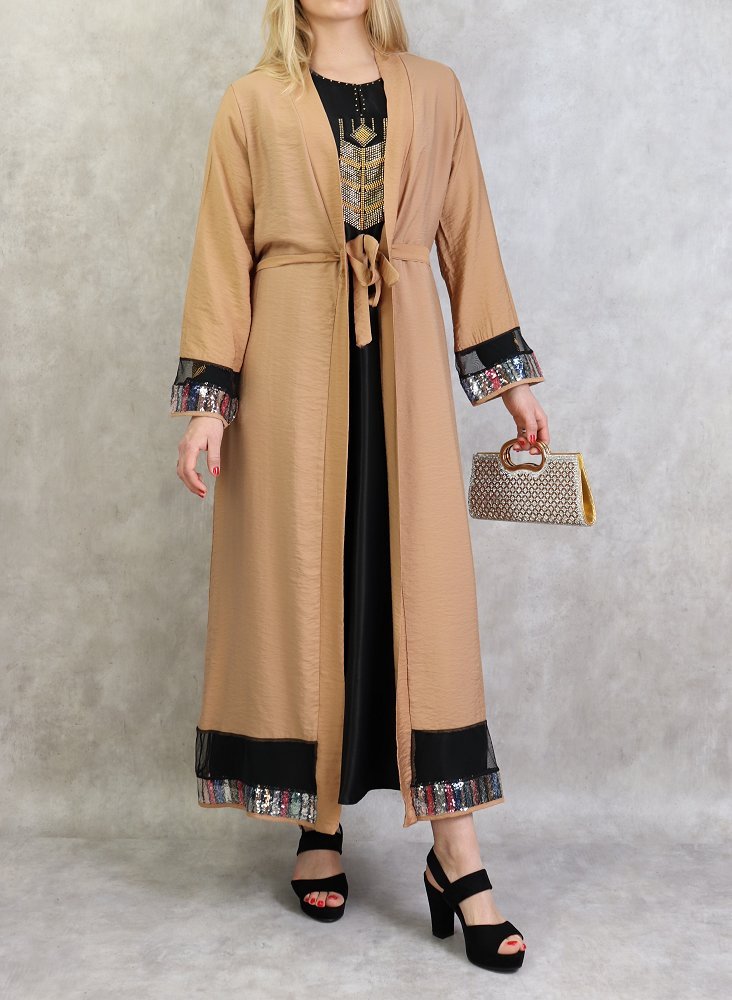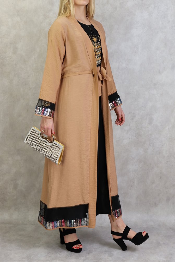 kimono long orné de tulle et strass de couleur beige Vetement & Accessoire