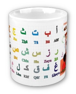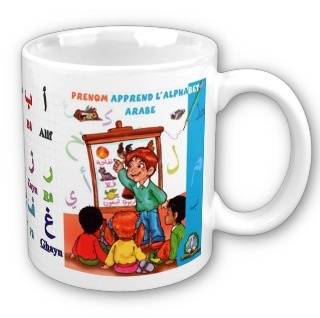 Vous pouvez personnaliser cette tasse au prénom de votre enfant. Par exemple "Rayan apprend l'alphabet arabe"