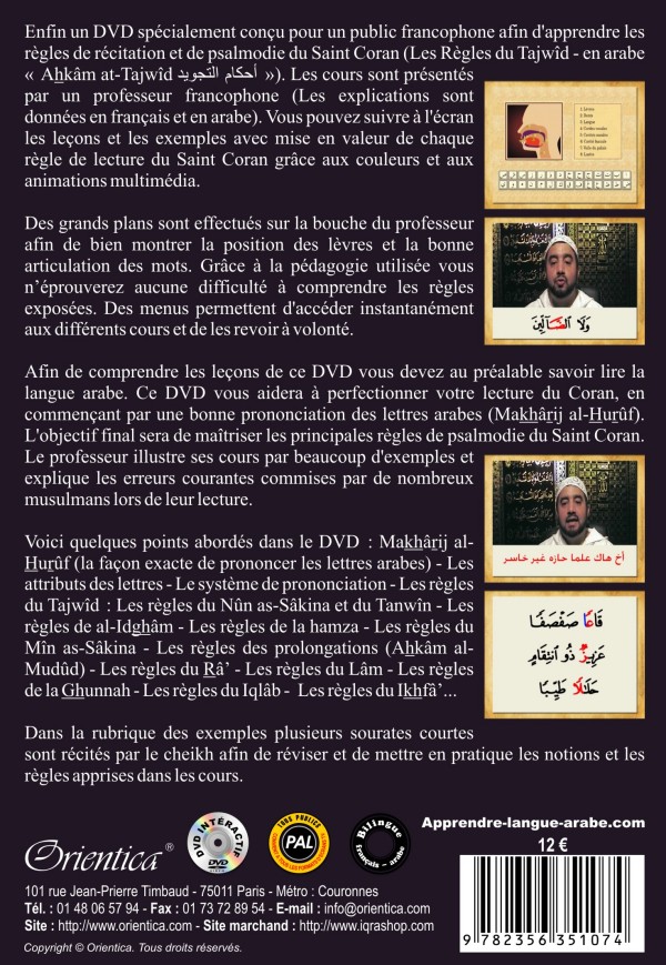 Enfin un DVD spécialement conçu pour un public francophone afin d'apprendre les règles de récitation et de psalmodie du Saint Coran (Les Règles du Tajwîd - en arabe « Ahkâm at-Tajwîd أحكام التجويد »). Les cours sont présentés par un professeur francophone (Les explications sont données en français et en arabe). Vous pouvez suivre à l'écran les leçons et les exemples avec mise en valeur de chaque règle de lecture du Saint Coran grâce aux couleurs et aux animations multimédia.