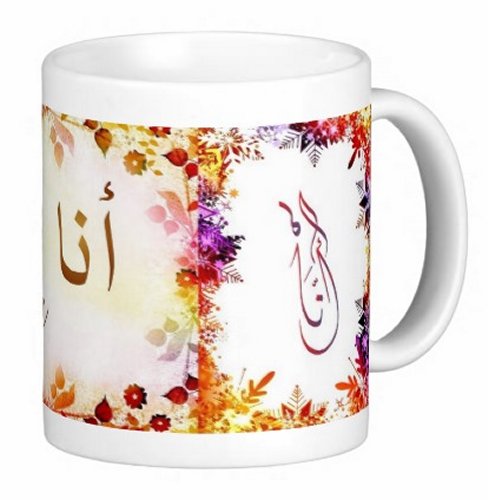Mug avec le prénom "Anna" écrit en français, en arabe (أنا) et calligraphié de façon artistique en arabe sur la partie droite.