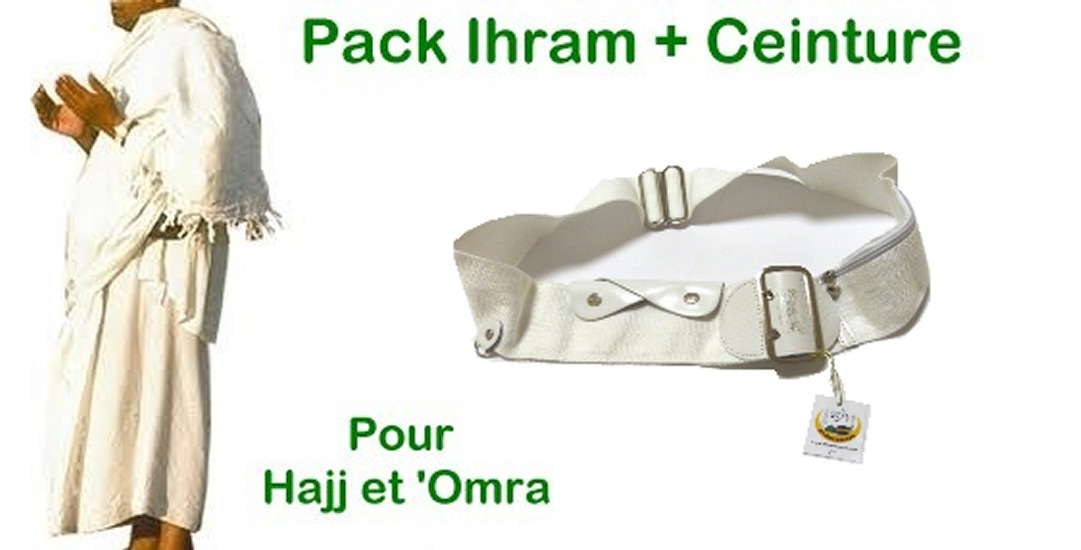 Pack constitué d'un ihram blanc de qualité (deux pièces 1200 g) et d'une ceinture spéciale pour le pèlerinage.