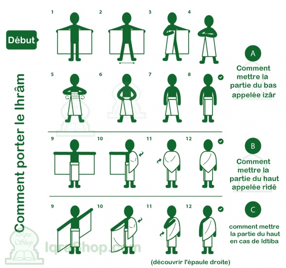 L’habit de l’ihrâm se compose de deux pièces de tissu blanc (un peu comme des grandes serviettes). Enroulez une pièce autour de votre taille de manière à vous couvrir complètement du nombril aux chevilles. Maintenez l’ihrâm en place avec la ceinture blanche fournie.