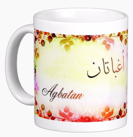 Mug avec le prénom "Agbatan" écrit en français, en arabe (اغبتان) et calligraphié de façon artistique en arabe sur la partie droite.