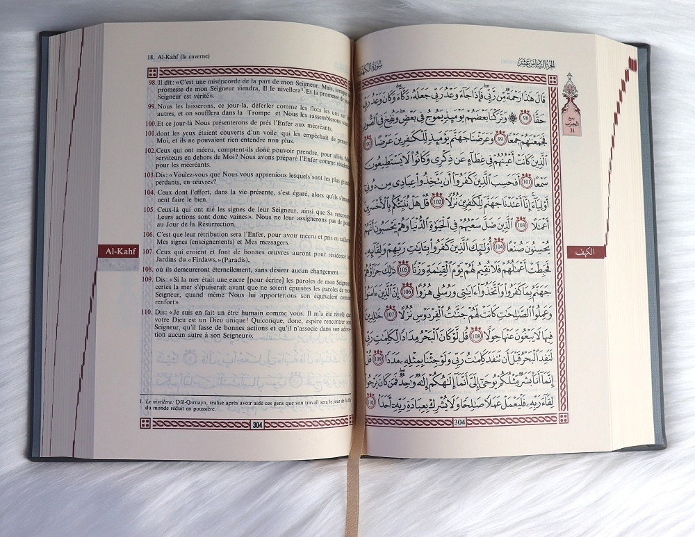 Avec index des sourates visible sur la tranche du livre permettant un accès plus rapide au début de chaque sourate. Pour les sourates longues, permet de connaître visuellement le nombre de pages qu'il nous reste à lire pour finir la sourate.