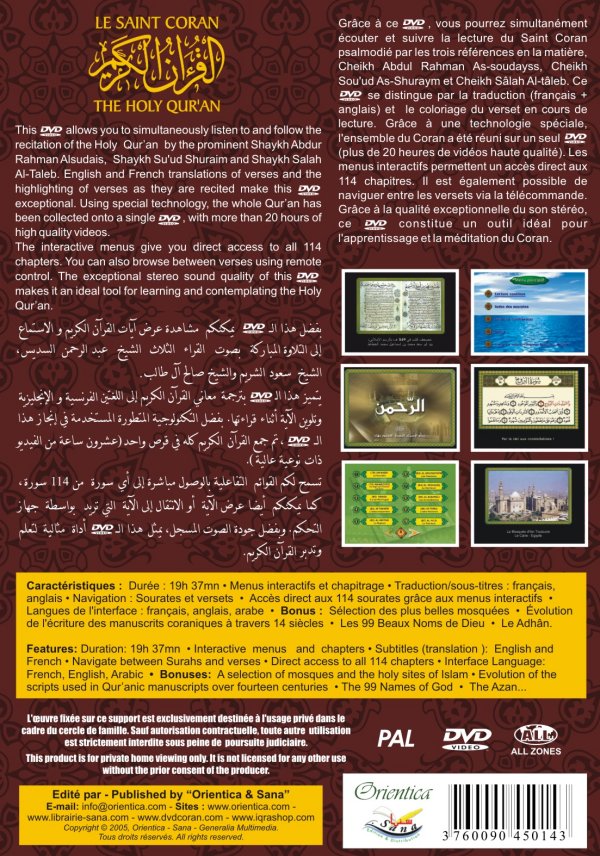 Grâce à ce DVD, unique au monde, vous pourrez simultanément écouter et suivre la lecture du Saint Coran psalmodié par les trois références en la matière, Cheikh Abdul Rahman As-soudayss, Cheikh Sou'ud As-Shuraym et Cheikh Sâlah Al-tâleb. Ce DVD se distingue par la traduction (français + anglais) et le coloriage du verset en cours de lecture. Grâce à une technologie spéciale, l'ensemble du Coran a été réuni sur un seul DVD (plus de 20 heures de vidéos haute qualité). Les menus interactifs permettent un accès direct aux 114 chapitres. Il est également possible de naviguer entre les versets via la télécommande. Grâce à la qualité exceptionnelle du son stéréo, ce DVD constitue un outil idéal pour l'apprentissage et la méditation du Coran.