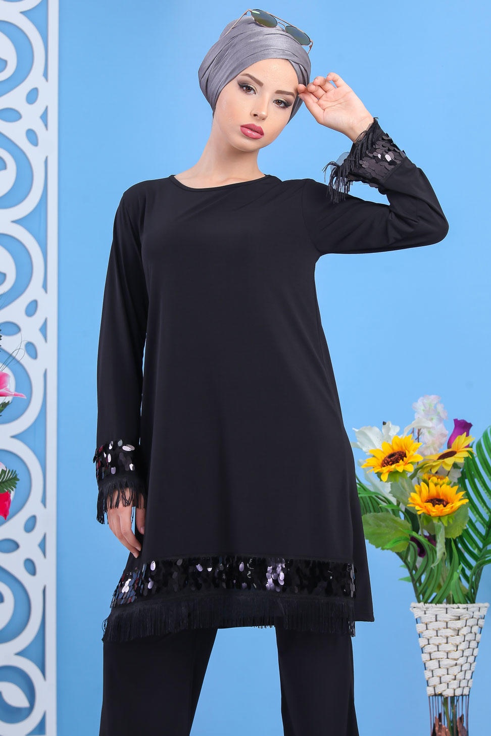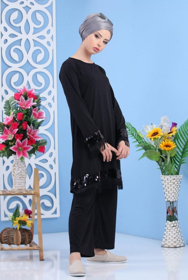 Ensemble tunique et jupe plissée de couleur noire et argentée (Vêtements pudique et chic pour femme - Marque Amelis Paris) - REF. 33791 (48.00 €)