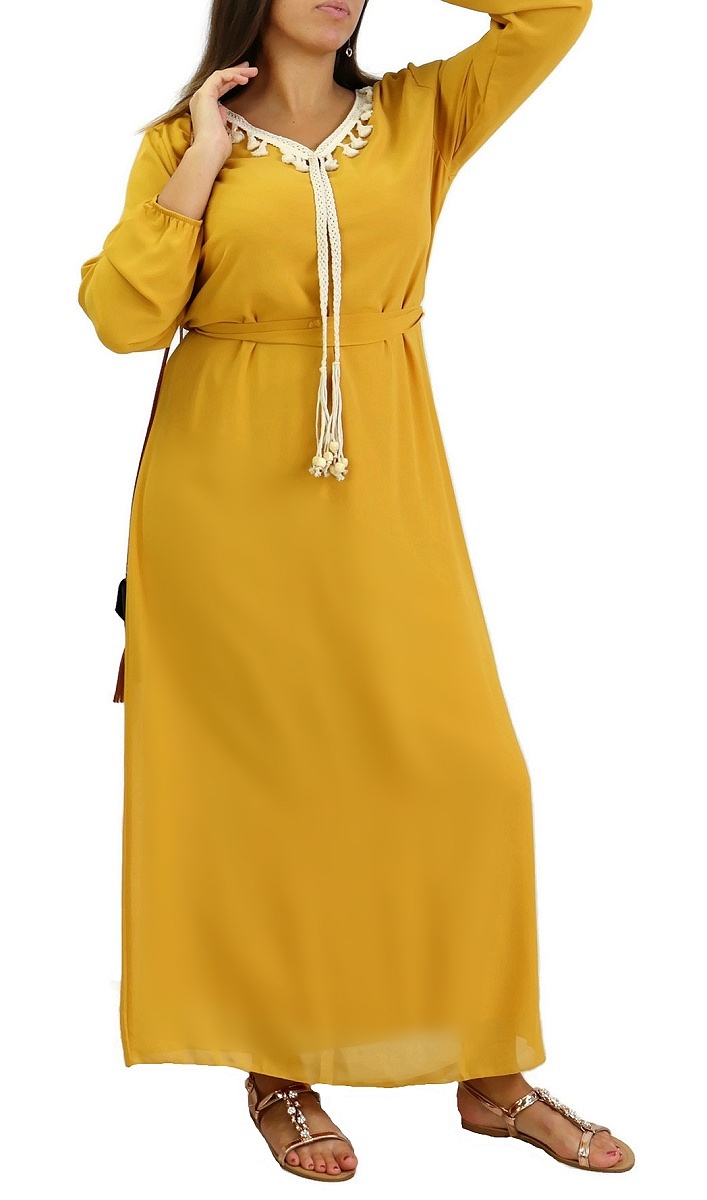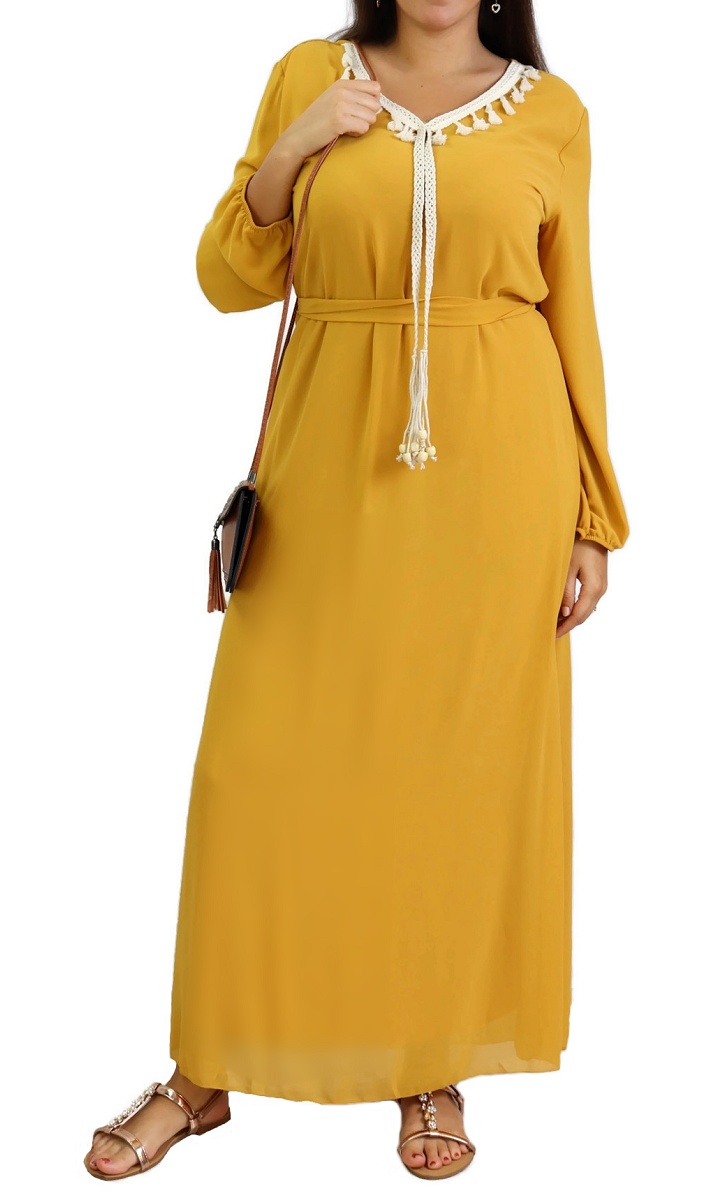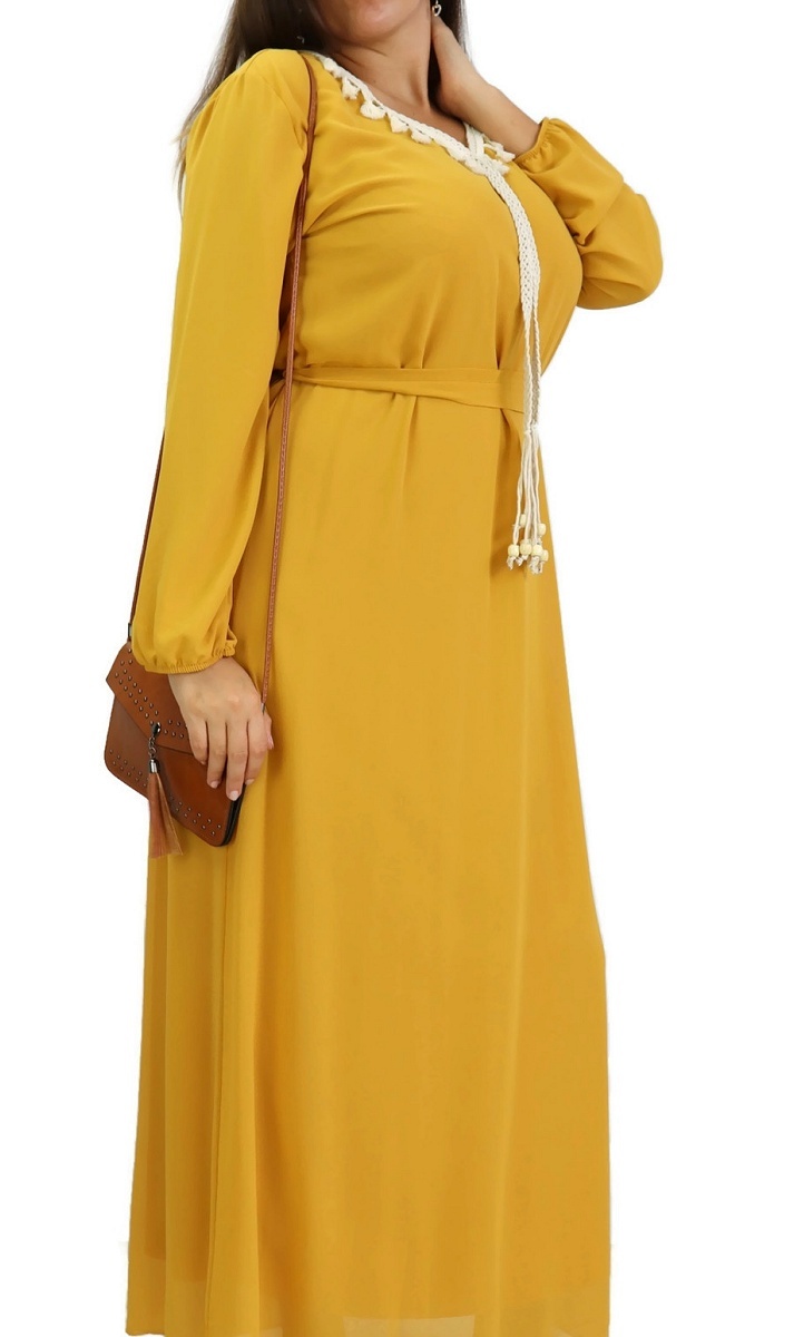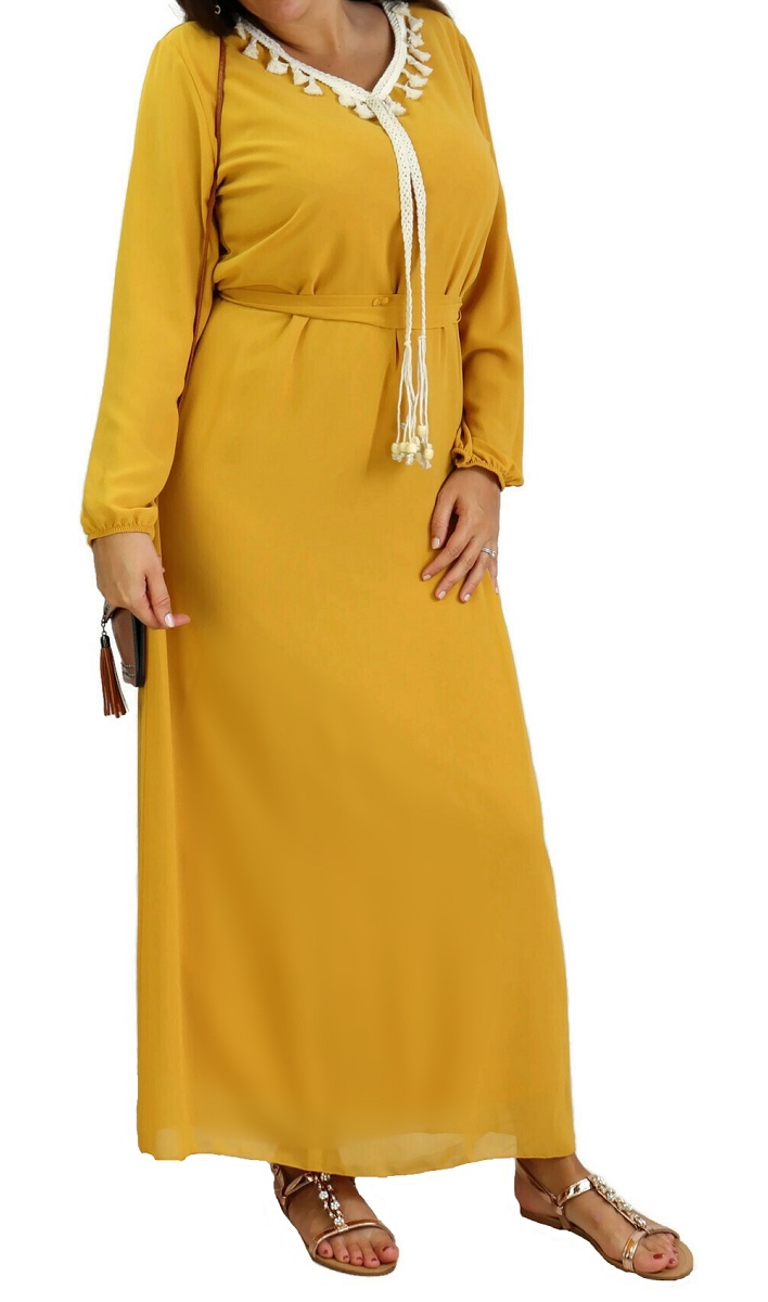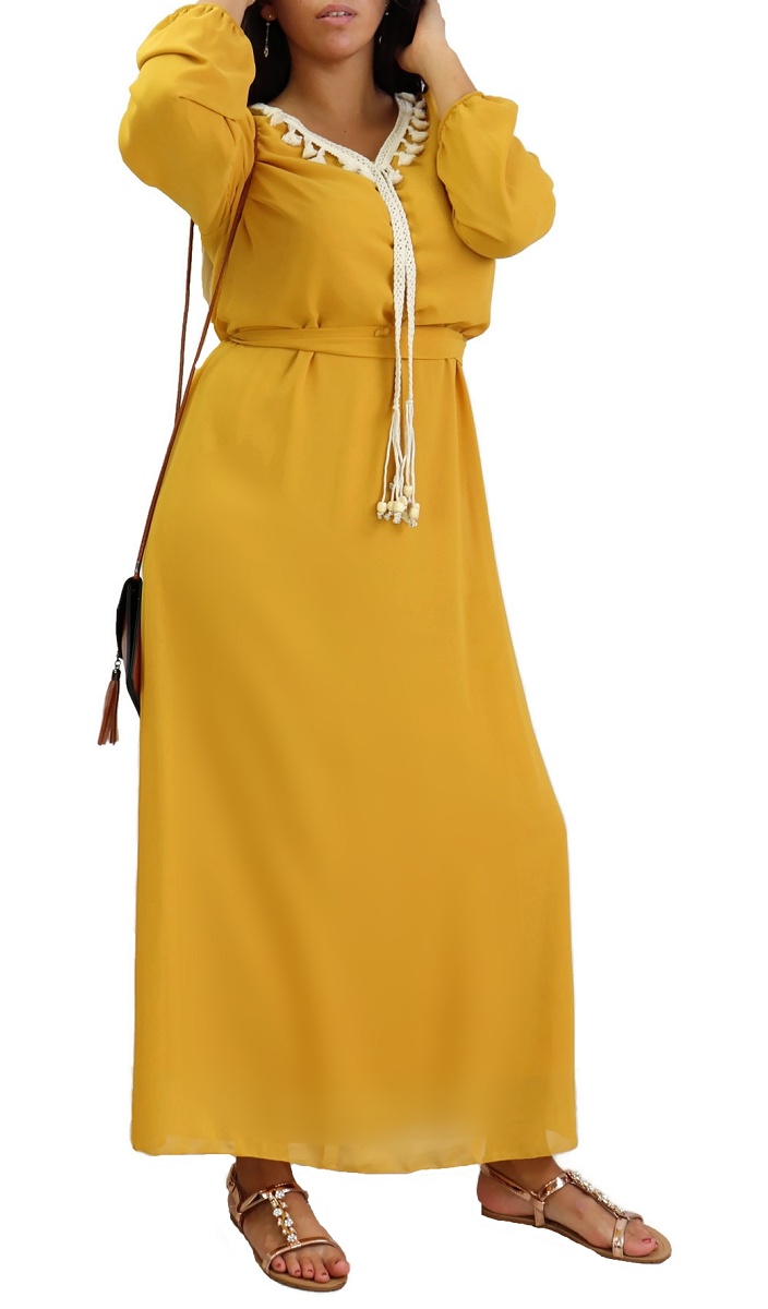 Robe col V entièrement doublée ornée de cordons beiges tressés, avec une jolie ceinture fine à nouer autour ou par derrière pour un effet cintré. Robe entièrement doublée. Tissu de type mousseline.