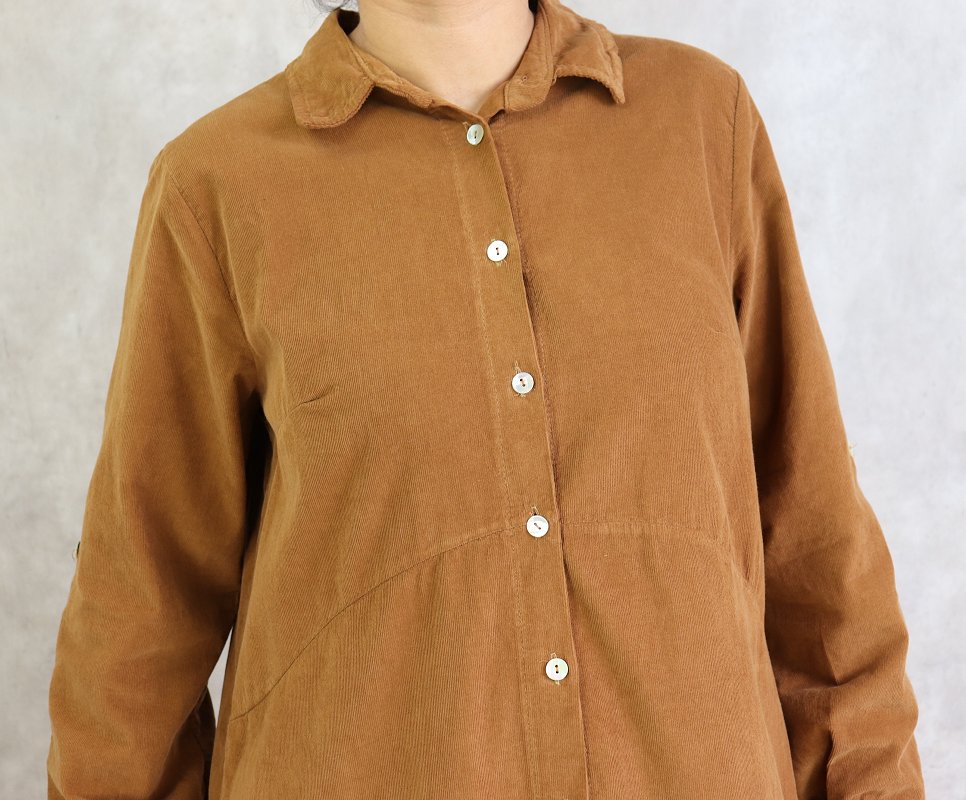 Robe chemisier en velours côtelé tendance en tissu doux et stretch. Est dotée d’un col classique et des manches longues retroussables.