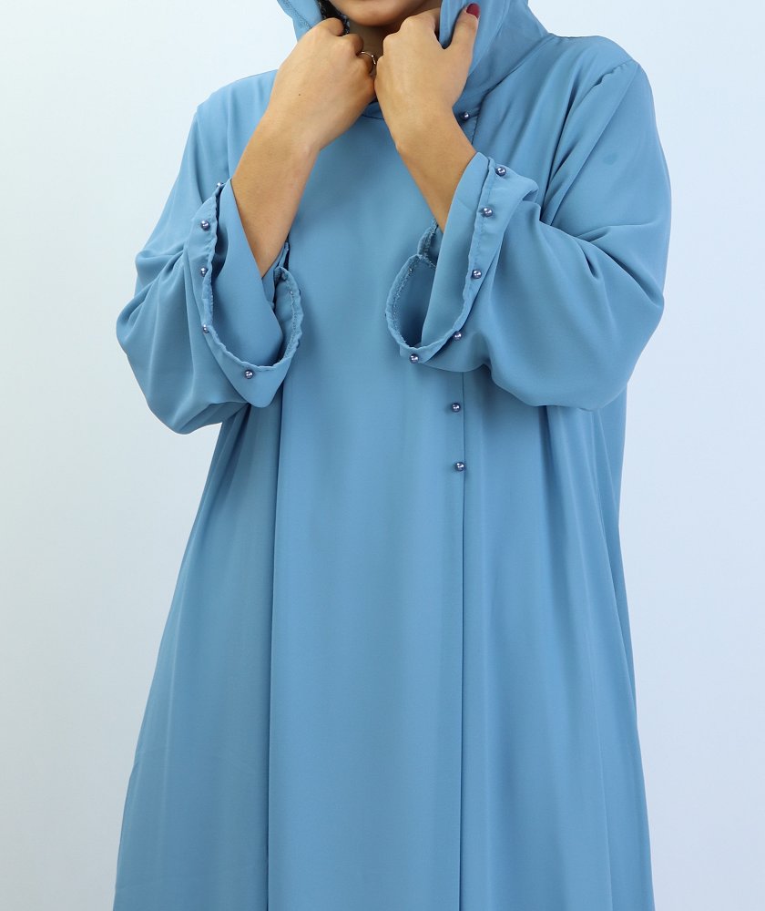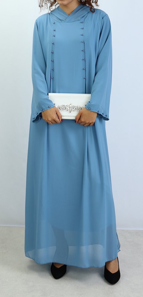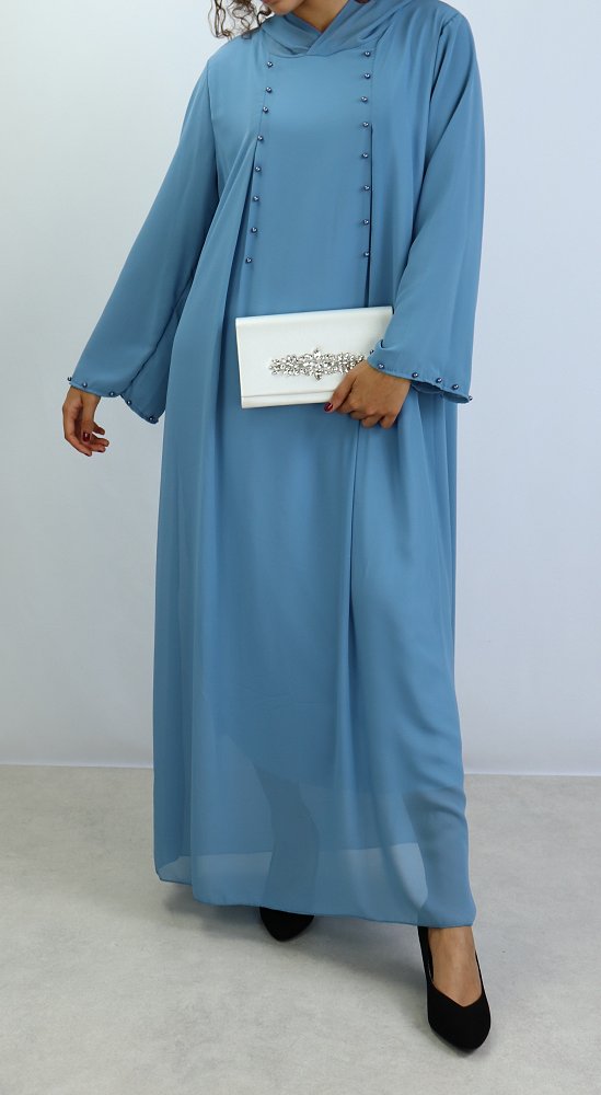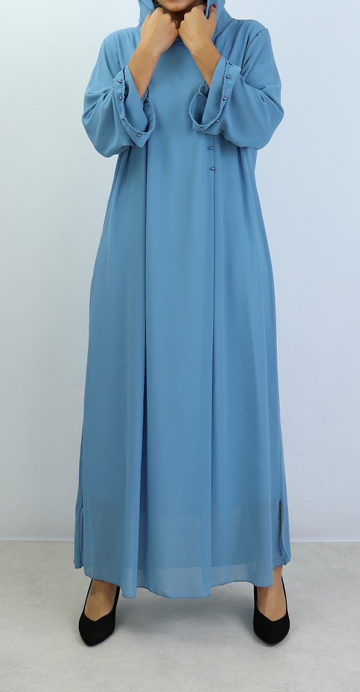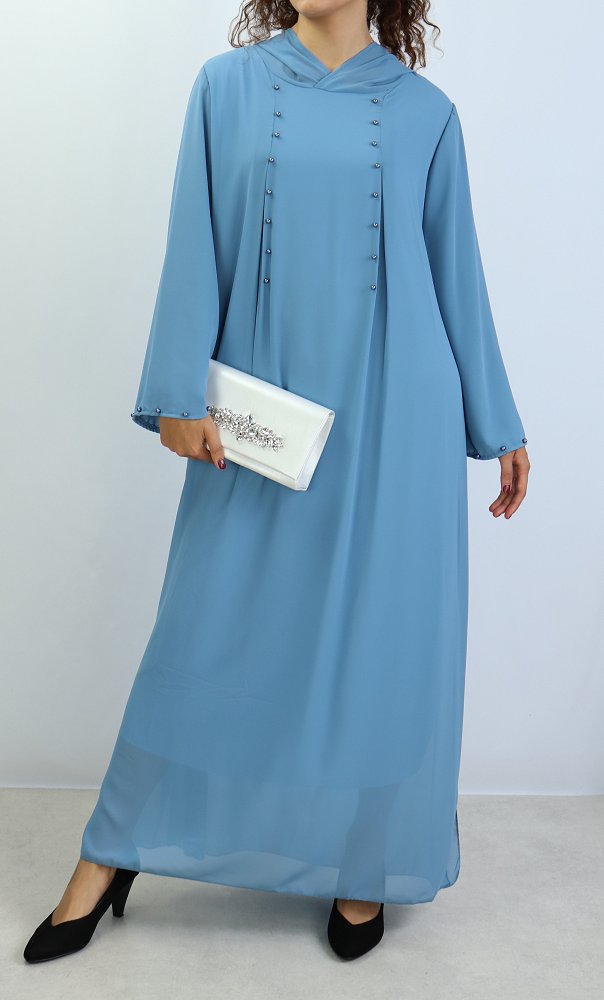 Robe longue, col capuche, entièrement doublée, manches longues, orné des perles sur le devant ainsi que les poignets. Sobre et élégant, Cette tenue s’accommode pour diverses occasions aussi bien festives que quotidiennes.