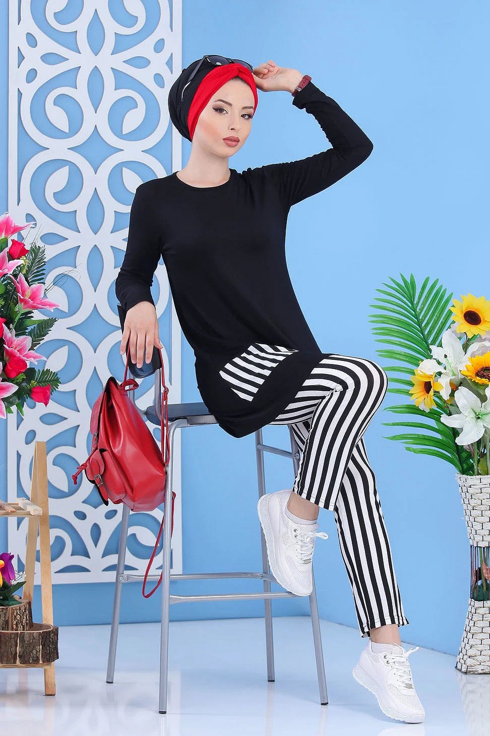 Ensemble à rayures 2 pièces (pantalon et tunique) noir et blanc - Tenue femme moderne Vetement & Accessoire
