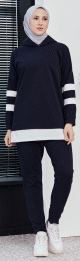 Survêtement femme deux pièces bicolore à capuche (Ensemble sport pas cher - Mode musulmane) - Couleur bleu marine avec bandes blanches - REF. 38277 (19.90 €)