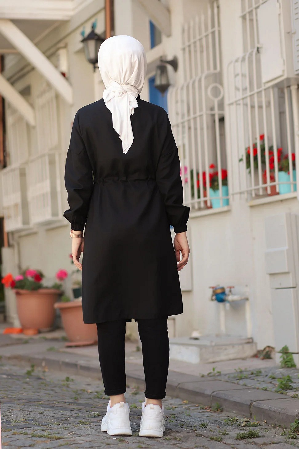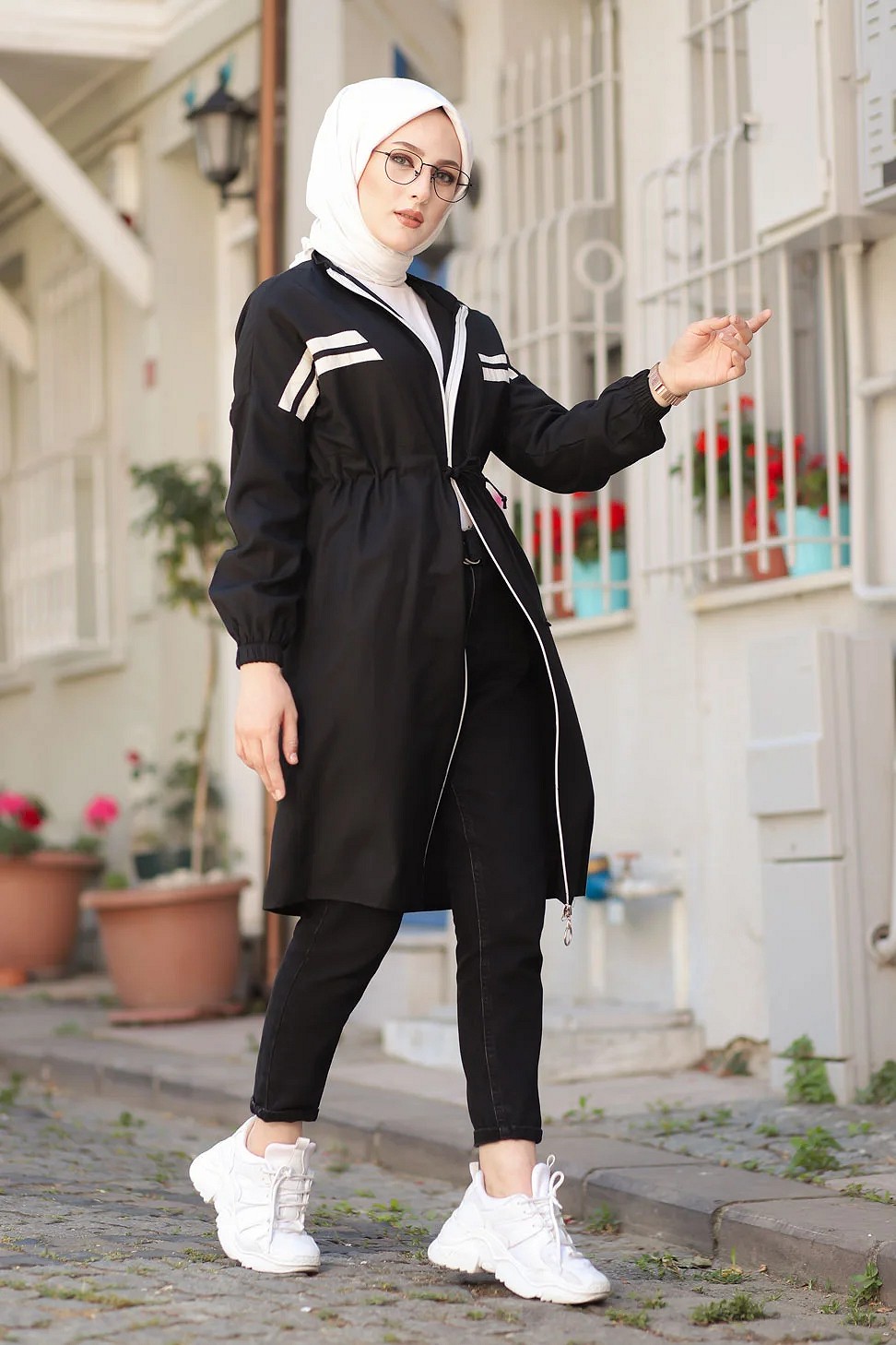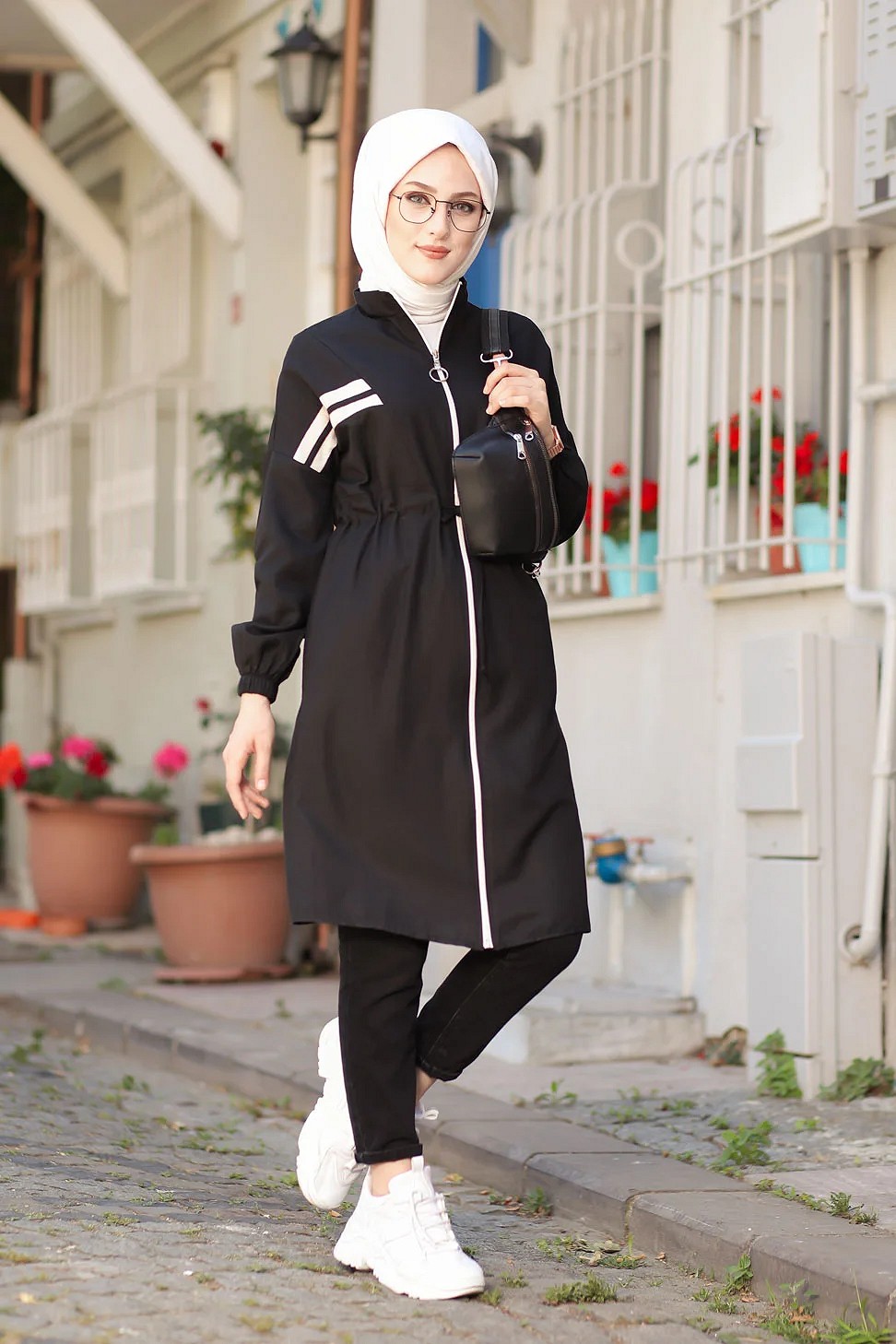 Modèle type sportswear au look moderne et décontracté, pièce maîtresse du dressing Modest Fashion pour la hijabia moderne. Petite touche design avec deux bandes blanches et sa ceinture attache intégrée.