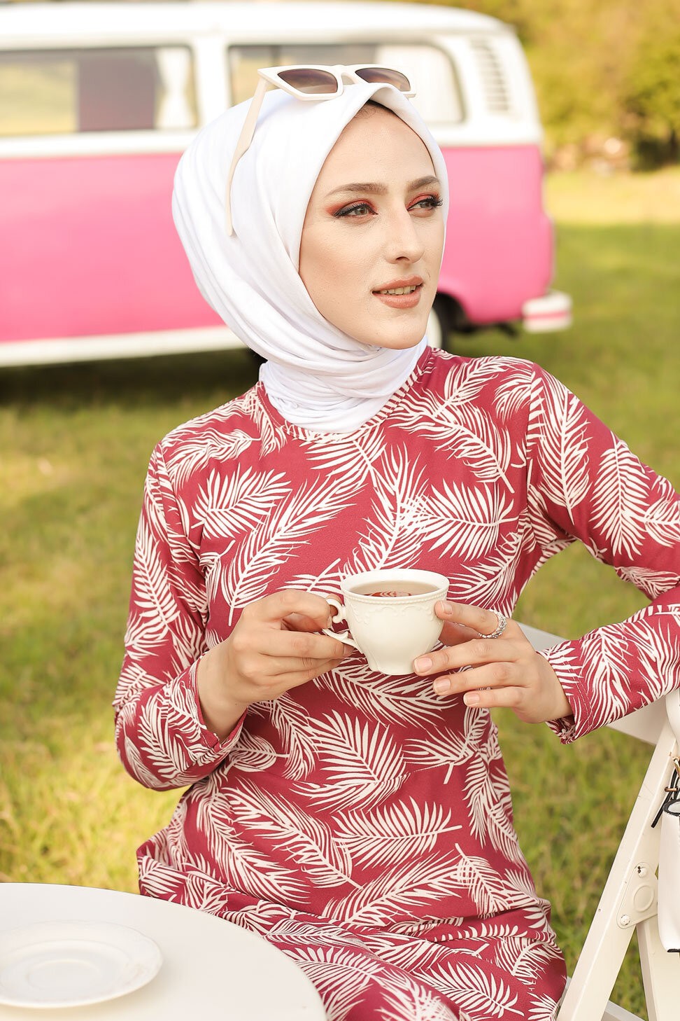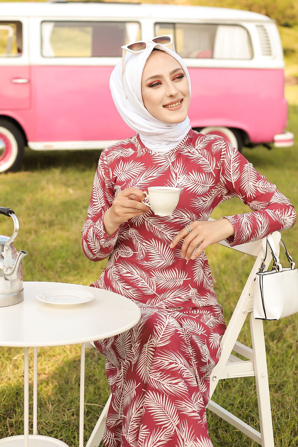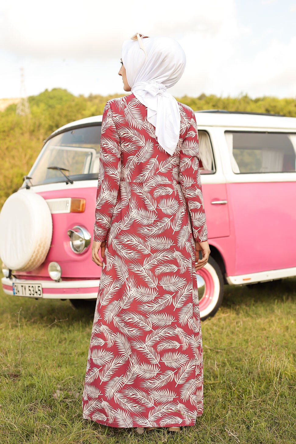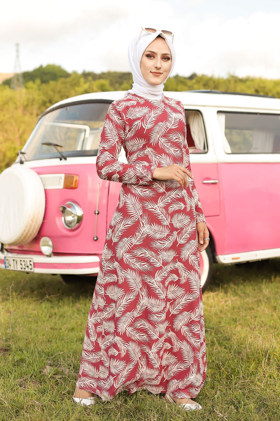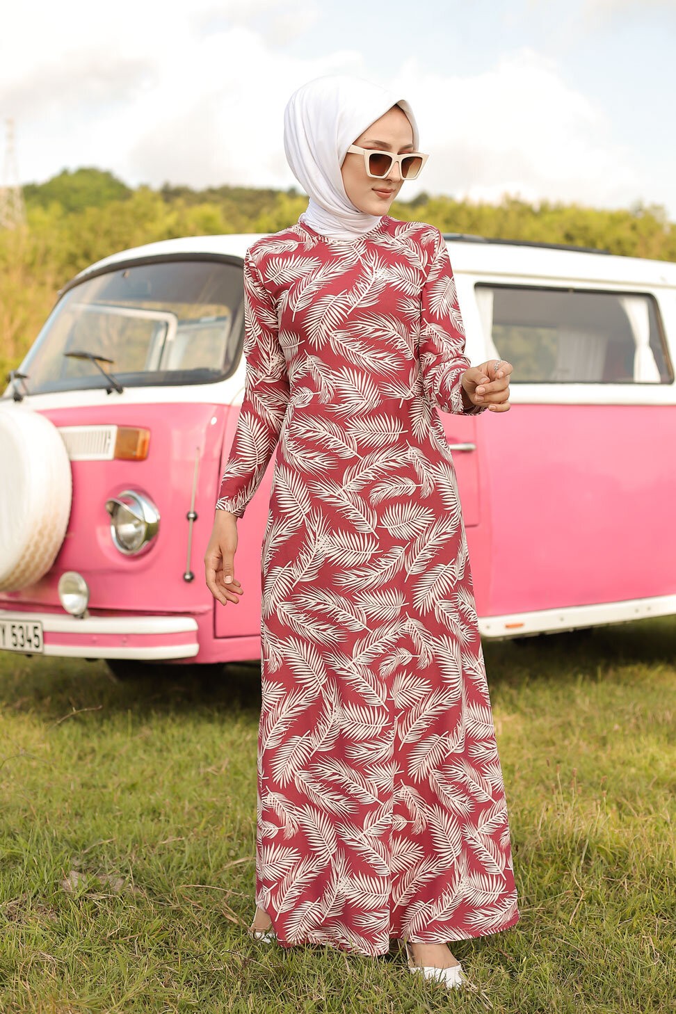 Robe longue imprimee motifs feuilles (Mode musulmane) - Couleur rose framboise
