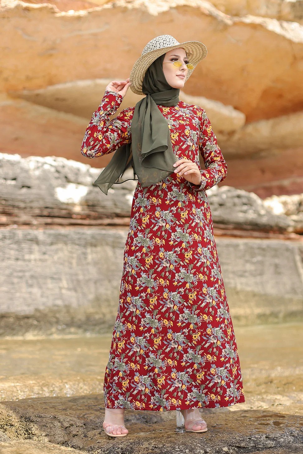 Robe longue évasée à motifs fleurs (Vente en ligne vetement femme musulmane) - Couleur rouge - REF. 32782 (28.00 €)