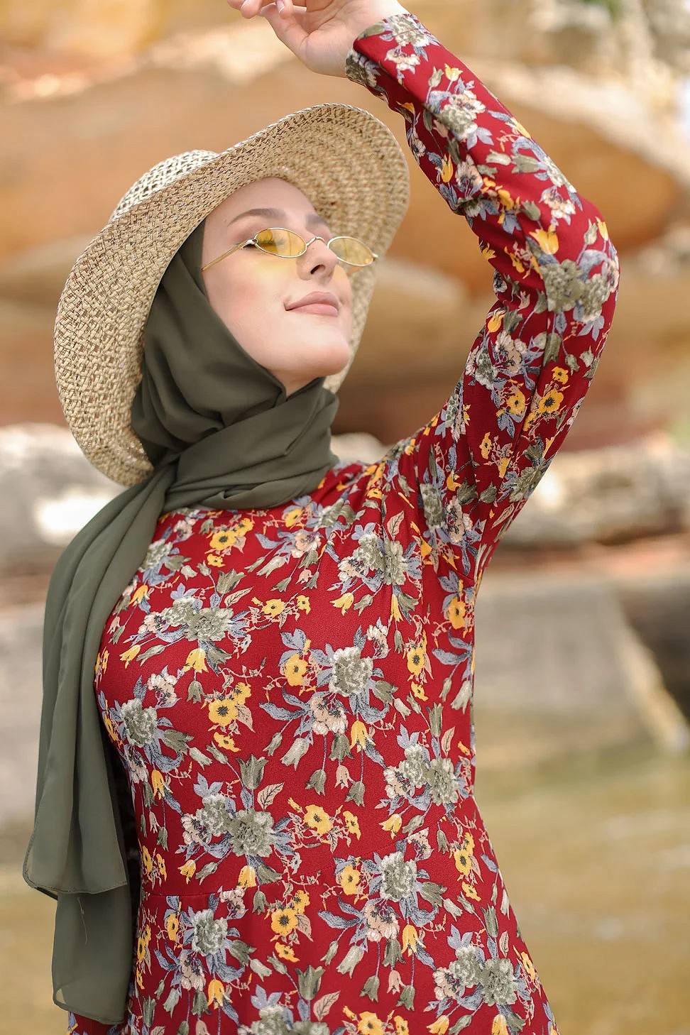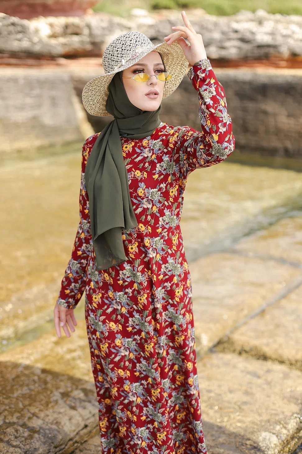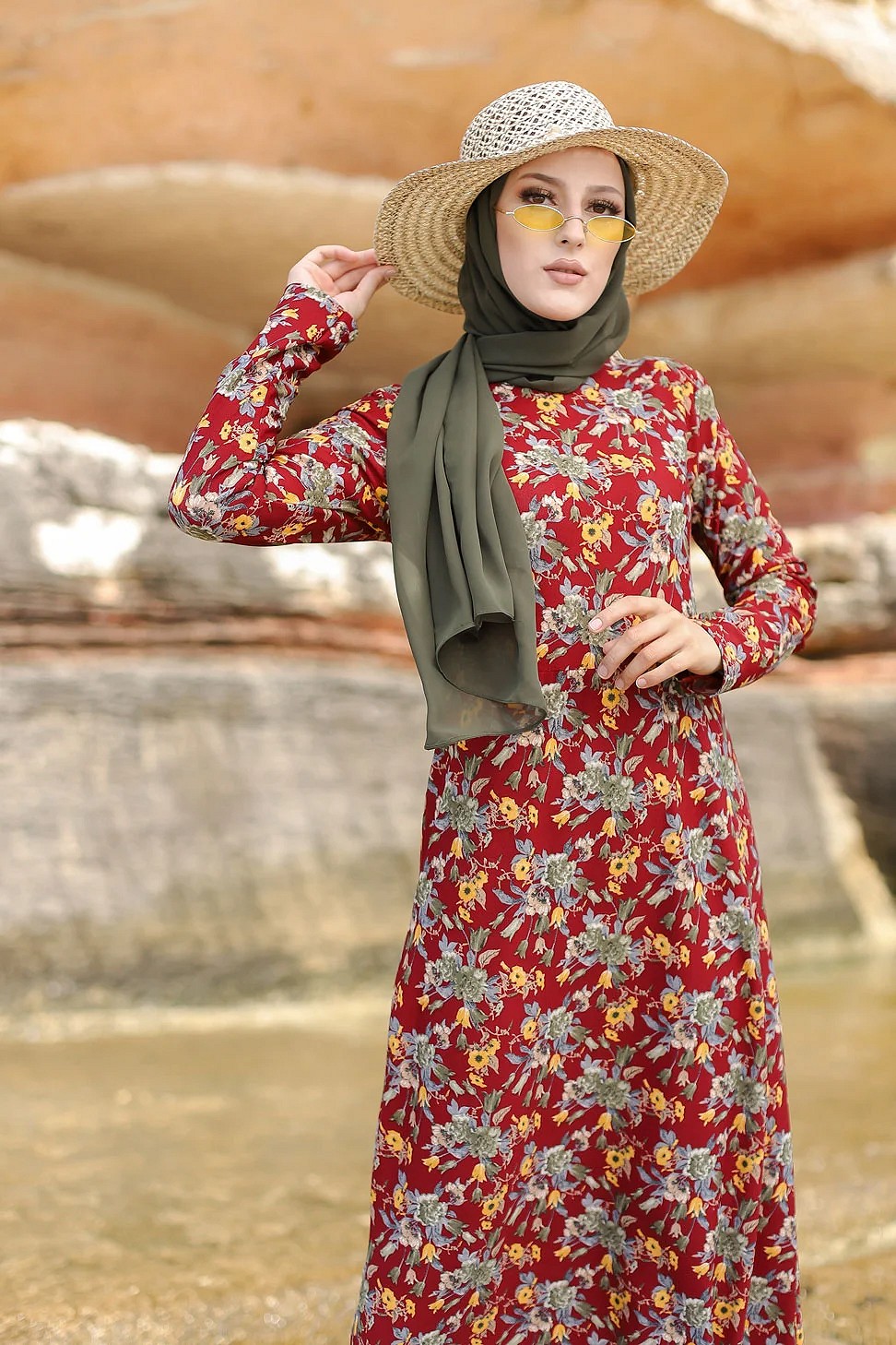 Robe longue fleurie sur un fond de couleur Grenat pour femme voilee (Boutique en ligne Modeste fashion France)