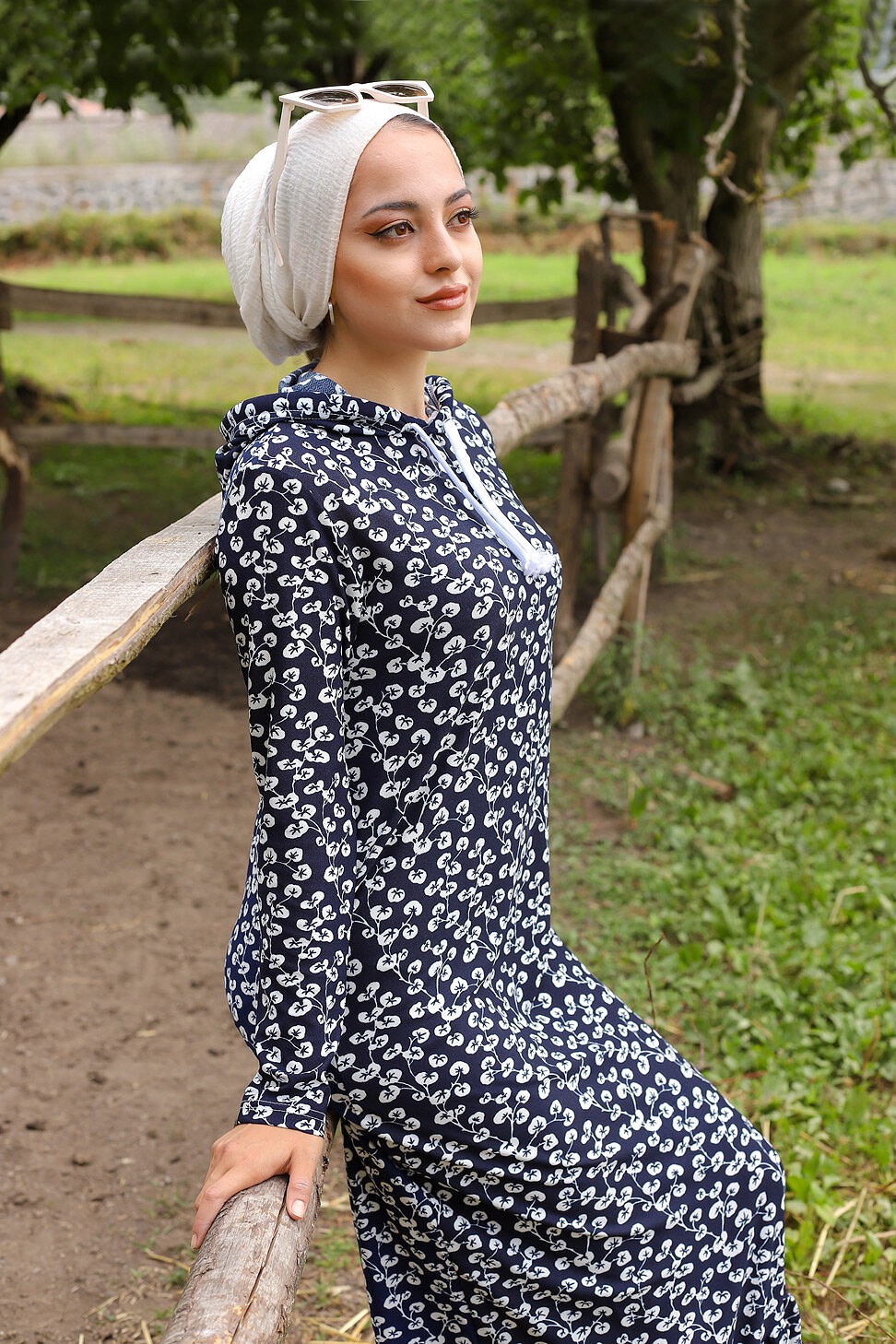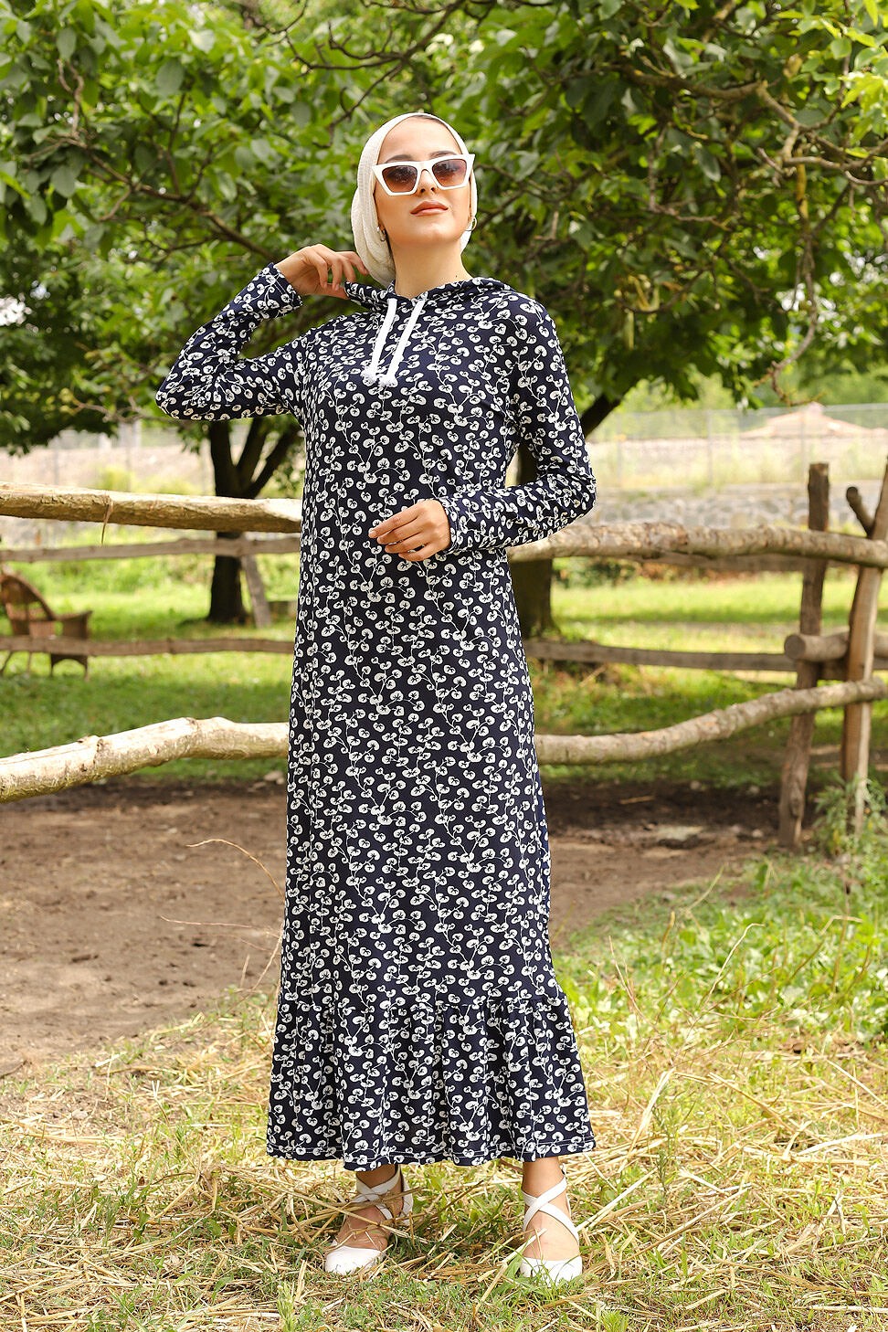 Robe longue à capuche finition volante à motifs feuilles nénuphar - Couleur bleu marine Vetement & Accessoire