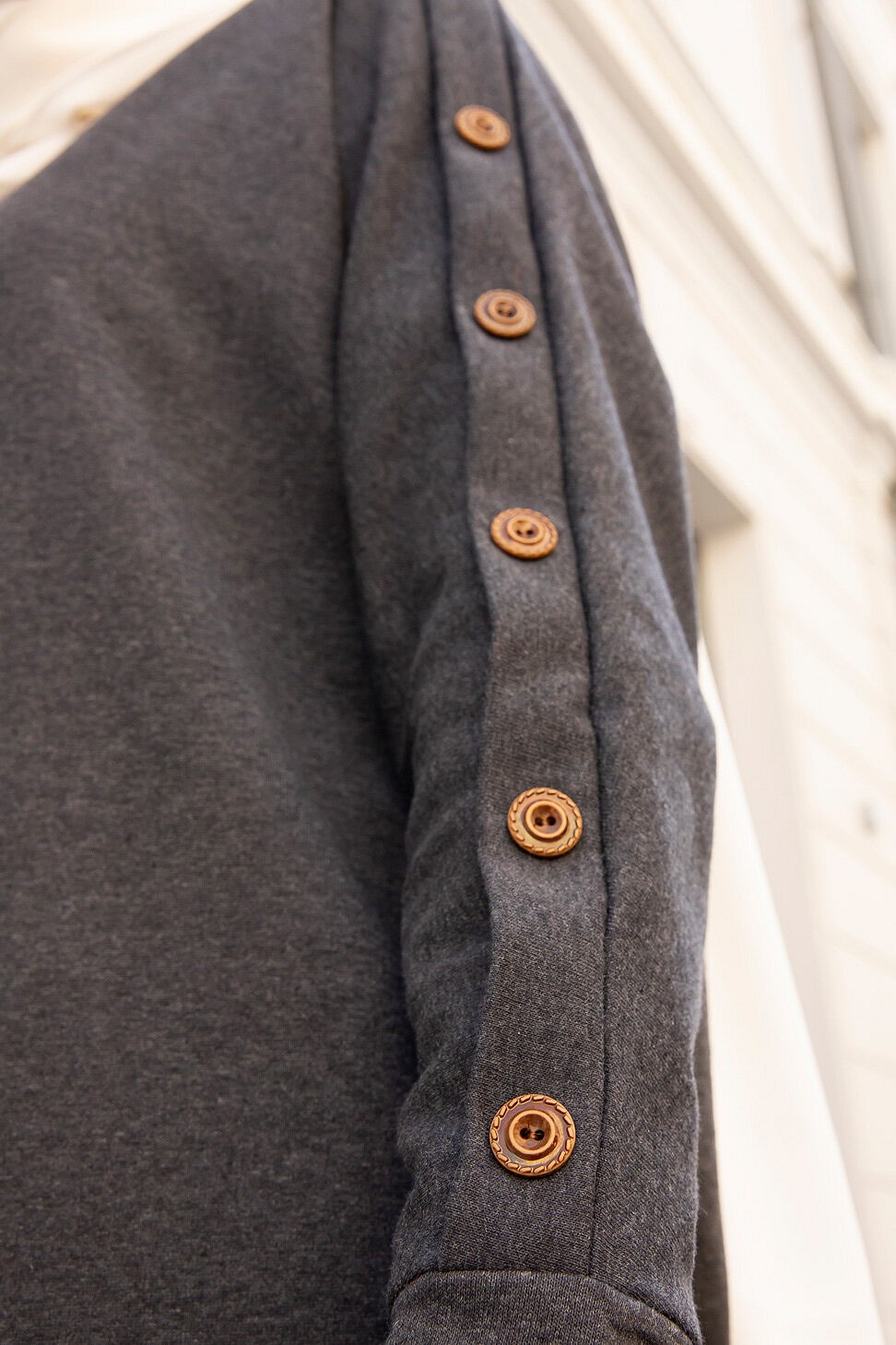 Sweat léger mi long, col rond, manches ornées de boutons décoratifs, coupe droite, tissu type sweat.
