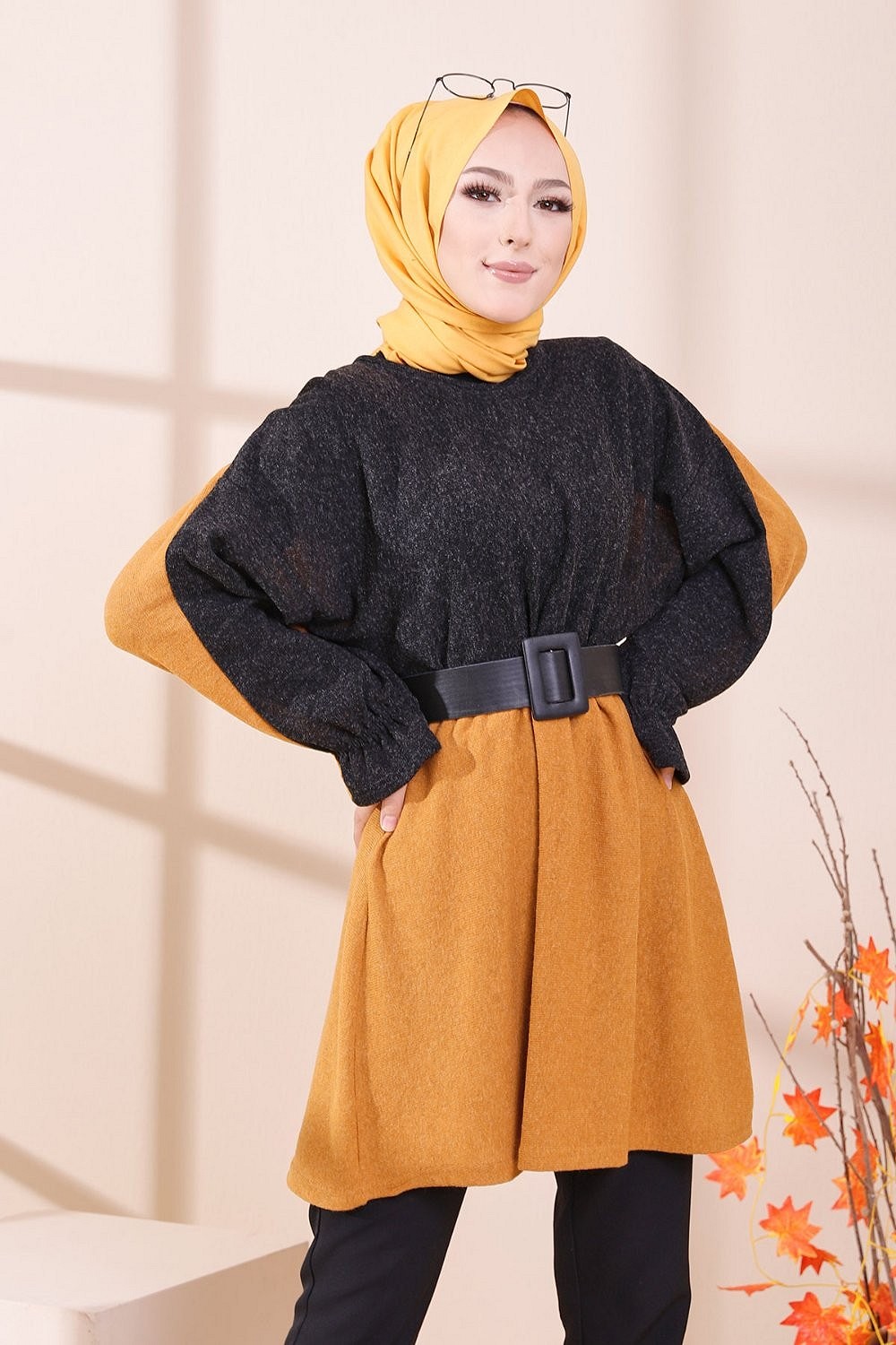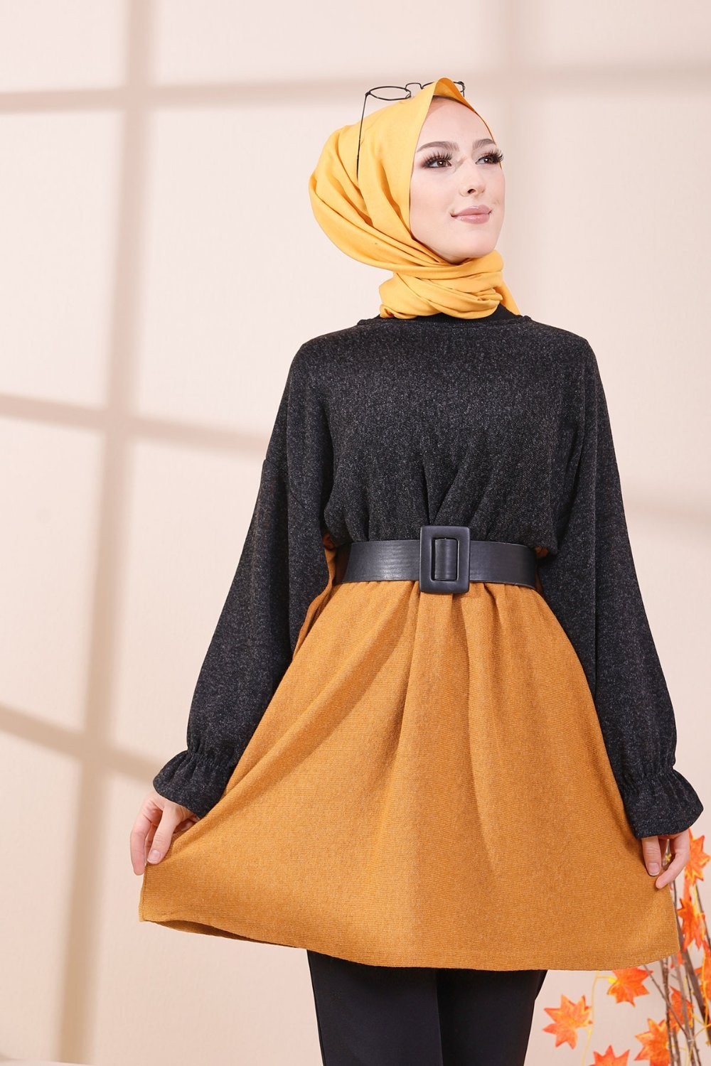Tunique bicolore pour femme (Vetement hijab) - Couleur noir et moutarde