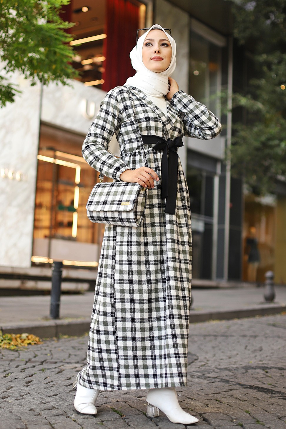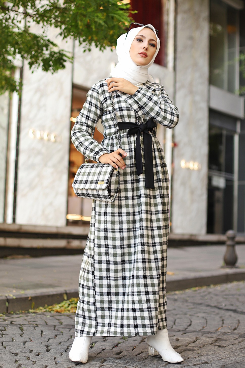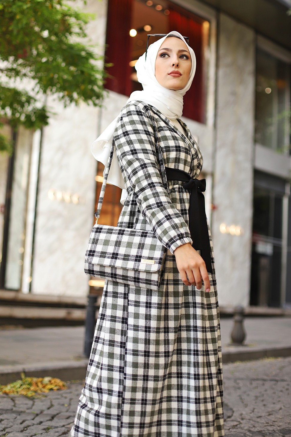 Ensemble Robe à carreaux avec sac à main assorti - Couleur blanc, noir et kaki Vetement & Accessoire