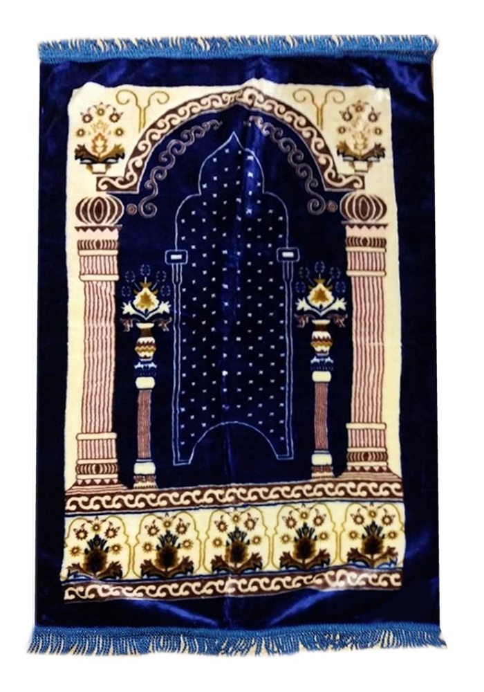 Tapis de prière musulman pour adulte bleu-marine motifs rosace et 2 piliers multicolores - REF. 40745 (6.90 €) -