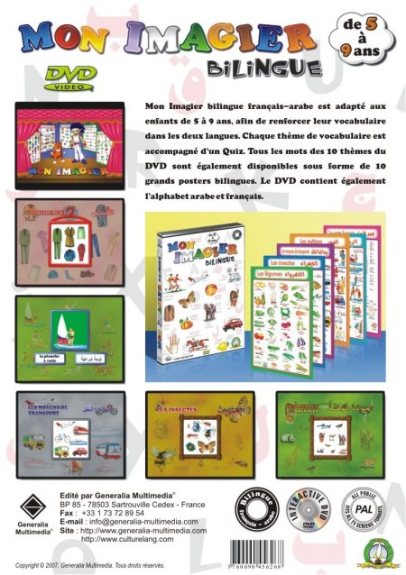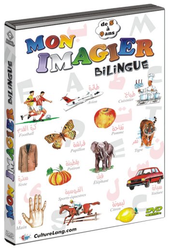 Mon Imagier bilingue français-arabe est adapté aux enfants de 5 à 9 ans, afin de renforcer leur vocabulaire dans les deux langues. Chaque thème de vocabulaire est accompagné d’un quiz. Tous les mots des 10 thèmes du DVD sont également disponibles sous forme de 10 grands posters bilingues. Le DVD contient également les alphabets arabe et français.